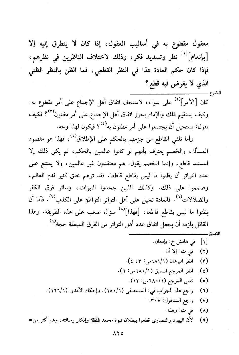 وأما تلقي القاطع من جزمهم بالحكم على الإطلاق، فهذا هو مقصود المسألة، والخصم يعترف بأنهم لو كانوا عالمين بالحكم، لم يكن ذلك إلا لمستند قاطع، وإنما الخصم يقول: هم معتقدون غير عالمين، ولا يمتنع على عدد التواتر أن يظنوا ما ليس بقاطع قاطعا. فقد توهم خلق كثير قدم العالم، وصمموا على ذلك. وكذلك الذين جحدوا النبوات، وسائر فرق الكفر والضلالات. فالعادة تحيل على أهل التواتر التواطؤ على الكذب. فأما أن يطنوا ما ليس بقاطع قاطعا، [فهذا] سؤال صعب على هذه الطريقة. وهذا القائل يلزمه أن يجعل اتفاق عدد أهل التواتر من الفرق المبطلة حجة.