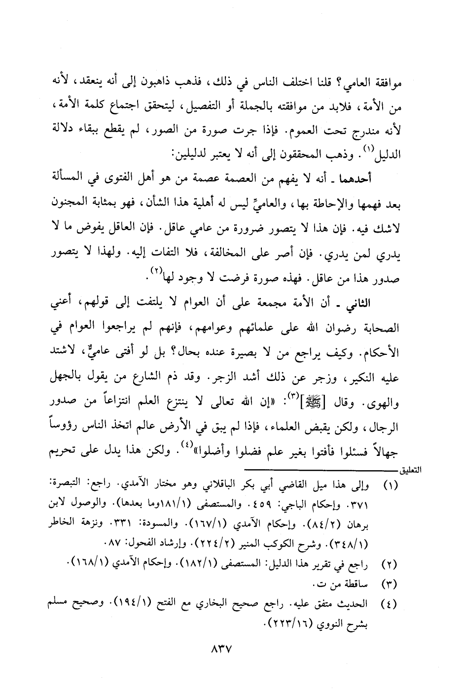 موافقة العامي؟ قلنا اختلف الناس في ذلك، فذهب ذاهبون إلى أنه ينعقد، لأنه من الأمة، فلابد من موافقته بالجملة أو التفصيل، ليتحقق اجتماع كلمة الأمة، لأنه مندرج تحت العموم. فإذا جرت صورة من الصور، لم يقطع ببقاء دلالة الدليل. وذهب المحققون إلى أنه لا يعتبر لدليلين: