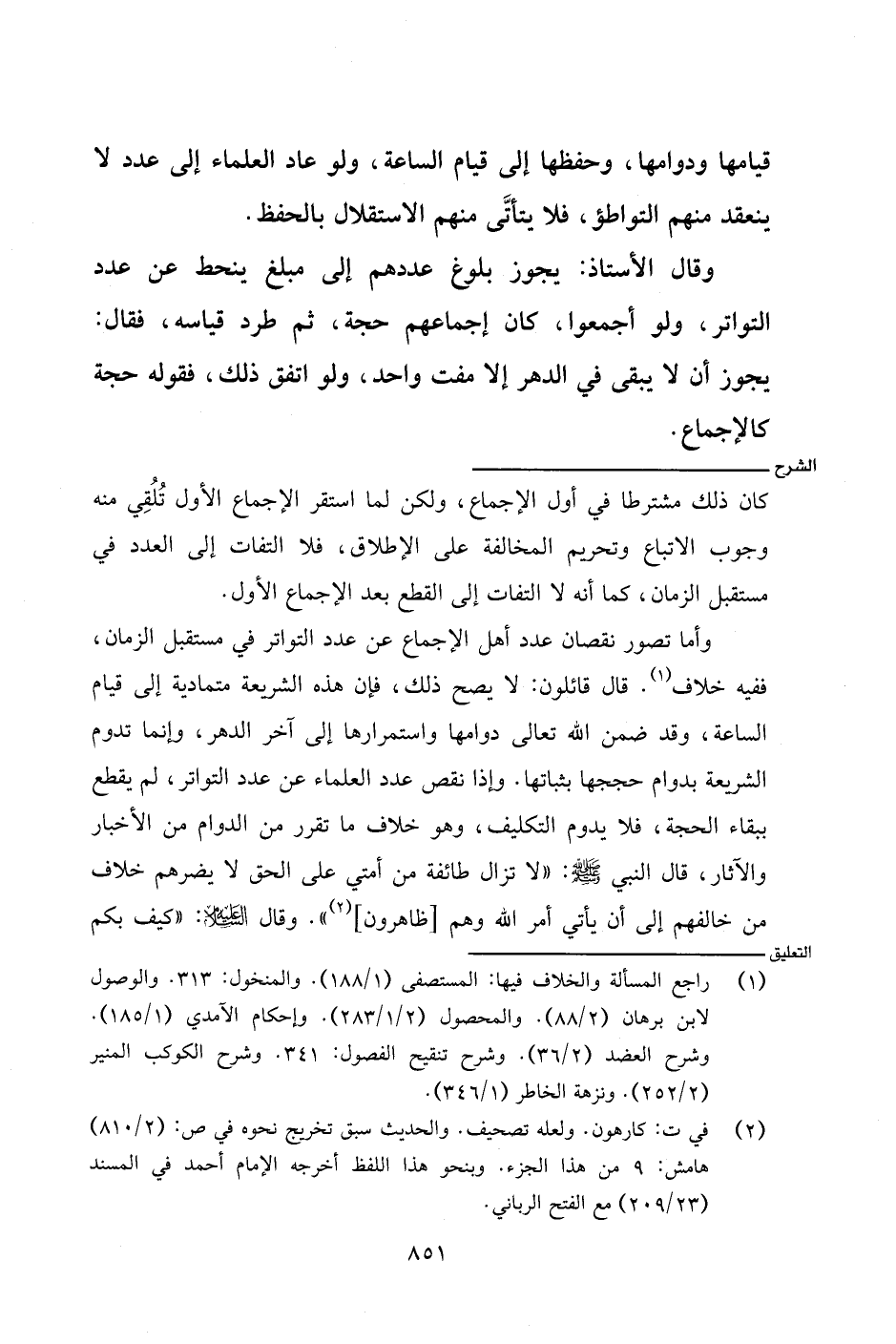 وأما تصور نقصان عدد أهل الإجماع عن عدد التواتر في مستقبل الزمان، ففيه خلاف. قال قائلون: لا يصح ذلك، فإن هذه الشريعة متمادية إلى قيام الساعة، وقد ضمن الله تعالى دوامها واستمرارها إلى آخر الدهر، وإنما تدوم الشريعة بدوام حججها بثباتها. وإذا نقص عدد العلماء عن عدد التواتر، لم يقطع ببقاء الحجة، فلا يدوم التكليف، وهو خلاف ما تقرر من الدوام من الأخبار والآثار، قال النبي - صلى الله عليه وسلم -: (لا تزال طائفة من أمتي على الحق لا يضرهم خلاف من خالفهم إلى أن يأتي أمر الله وهم [ظاهرون]). وقال - عليه السلام -: (كيف بكم