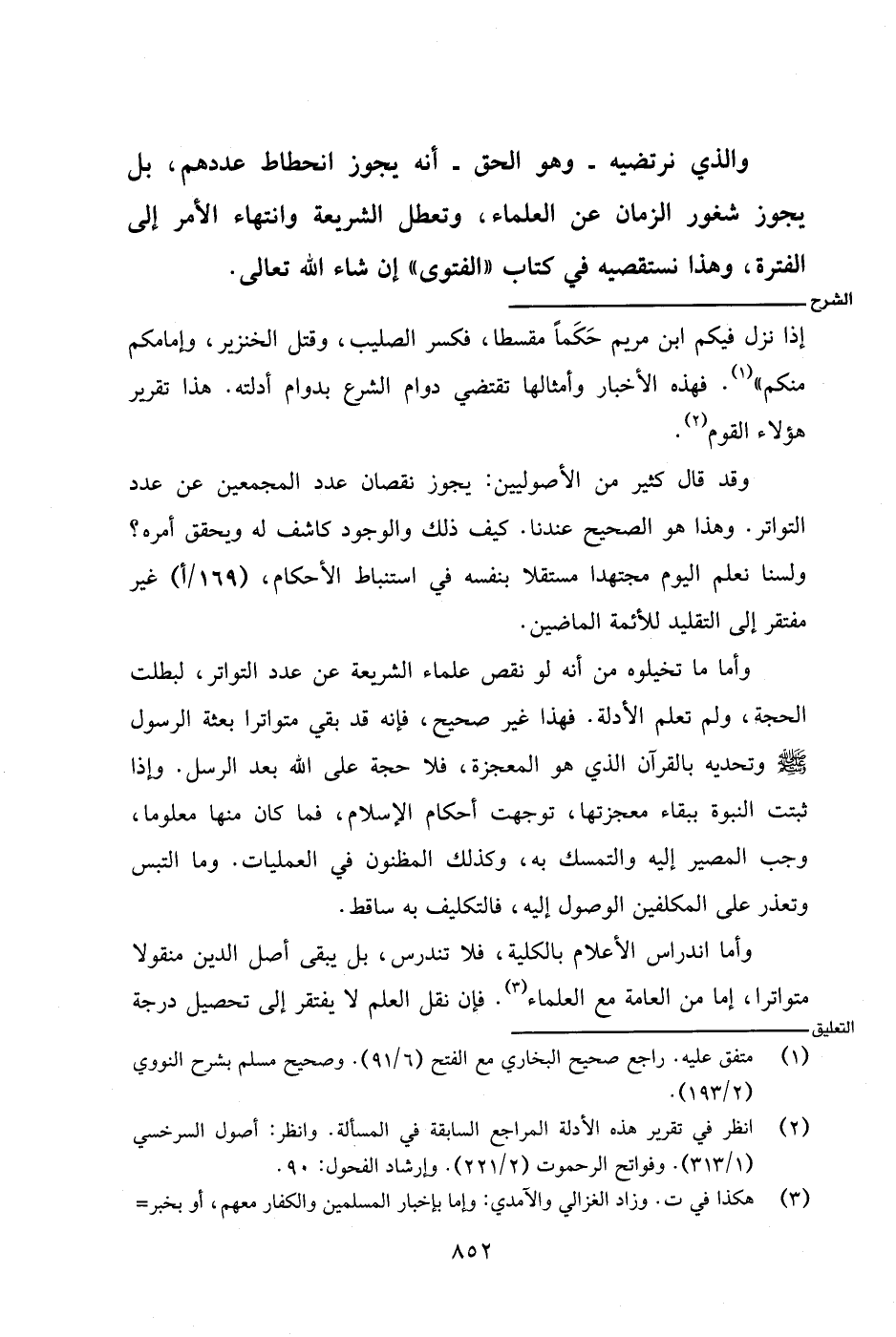 إذا نزل فيكم ابن مريم حكمًا مقسطا، فكسر الصليب، وقتل الخنزير، وإمامكم منكم). فهذه الأخبار وأمثالها تقتضي دوام الشرع بدوام أدلته. هذا تقرير هؤلاء القوم.