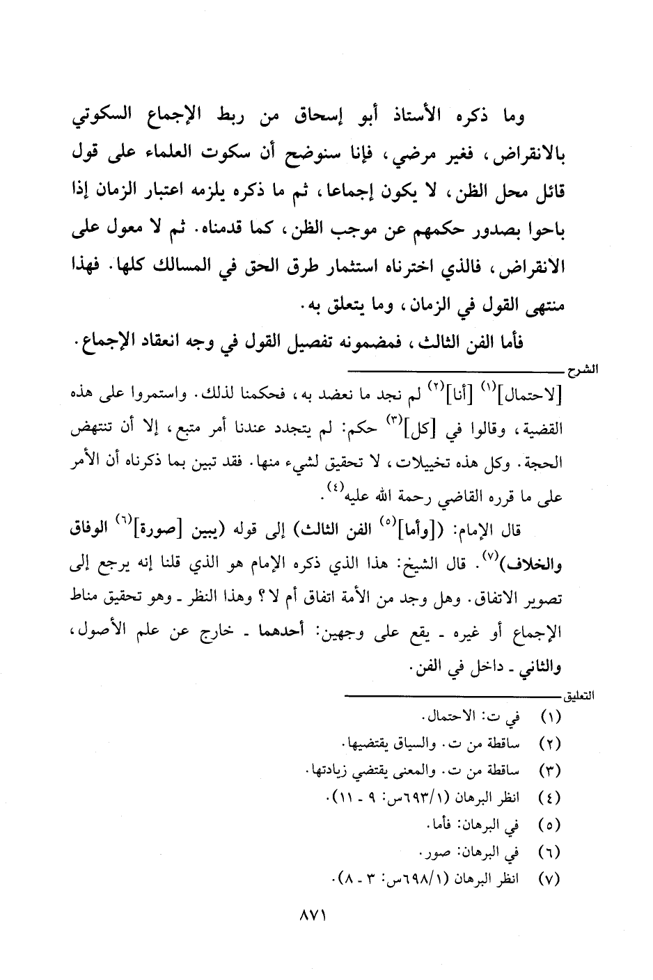 قال الإمام: ([وأما] الفن الثالث) إلى قوله (يبين [صورة] الوفاق والخلاف). قال الشيخ: هذا الذي ذكره الإمام هو الذي قلنا إنه يرجع إلى تصوير الاتفاق. وهل وجد من الأمة اتفاق أم لا؟ وهذا النظر - وهو تحقيق مناط الإجماع أو غيره - يقع على وجهين: أحدهما - خارج عن علم الأصول، والثاني - داخل في الفن.