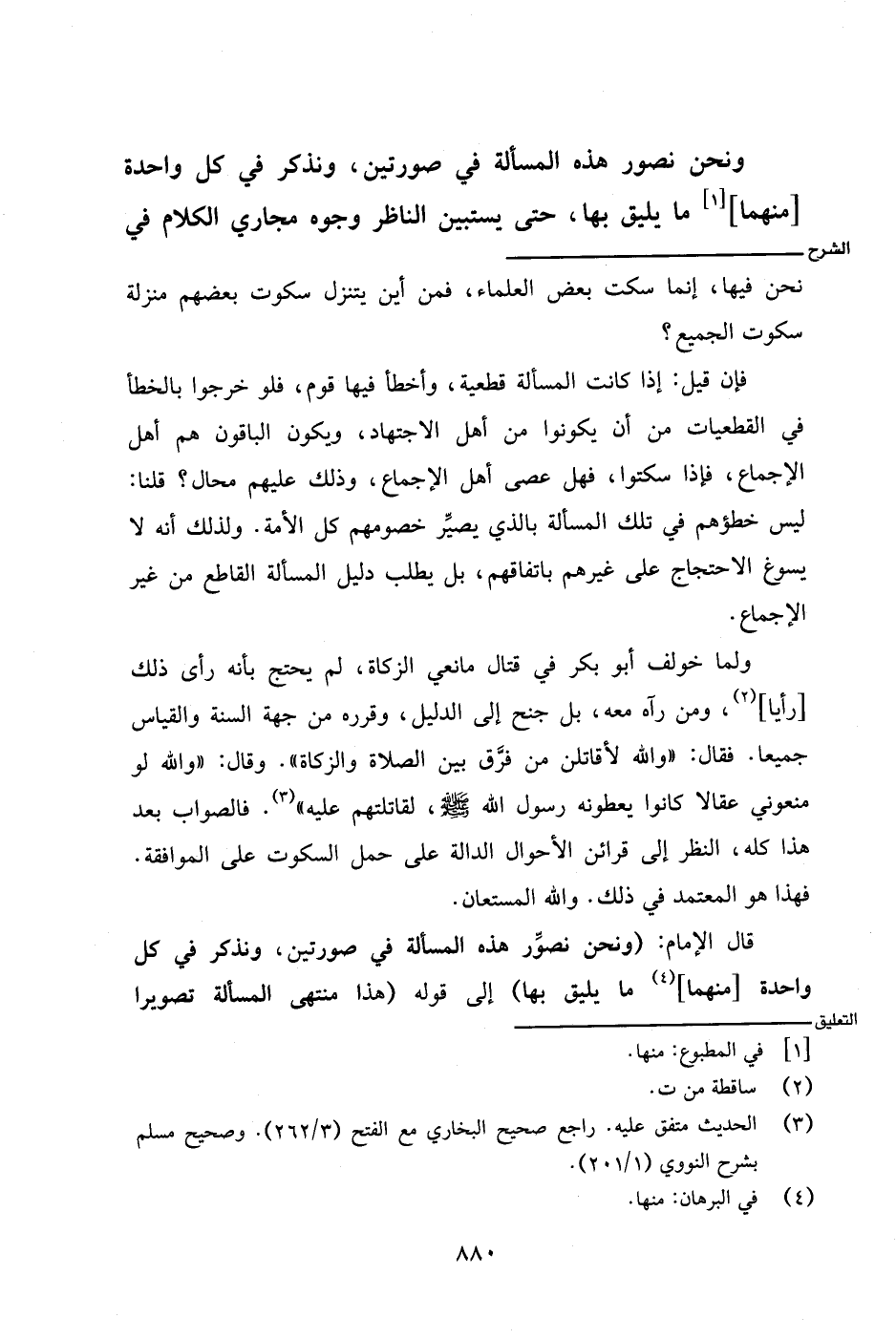 ولما خولف أبو بكر في قتال مانعي الزكاة، لم يحتج بأنه رأى ذلك [رأيا]، ومن رآه معه، بل جنح إلى الدليل، وقرره من جهة السنة والقياس جميعا. فقال: (والله لأقاتلن من فرق بين الصلاة والزكاة). وقال: (والله لو منعوني عقالا كانوا يعطونه رسول الله - صلى الله عليه وسلم -، لقاتلتهم عليه). فالصواب بعد هذا كله، النظر إلى قرائن الأحوال الدالة على حمل السكوت على الموافقة. فهذا هو المعتمد في ذلك. والله المستعان.