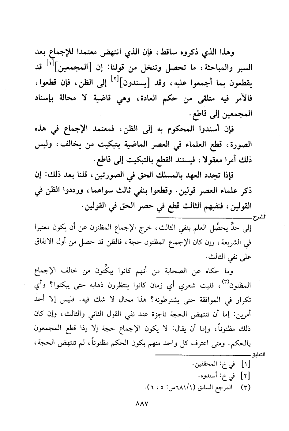 وما حكاه عن الصحابة من أنهم كانوا يبكتون من خالف الإجماع المظنون، فليت شعري أي زمان كانوا ينتظرون ذهابه حتى يبكتوا؟ وأي تكرار في الموافقة حتى يشترطونه؟ هذا محال لا شك فيه. فليس إلا أحد أمرين: إما أن تنتهض الحجة ناجزة عند نفي القول الثاني والثالث، وإن كان ذلك مظنونًا، وإما أن يقال: لا يكون الإجماع حجة إلا إذا قطع المجمعون بالحكم. ومتى اعترف كل واحد منهم بكون الحكم مظنونًا، لم تنتهض الحجة،