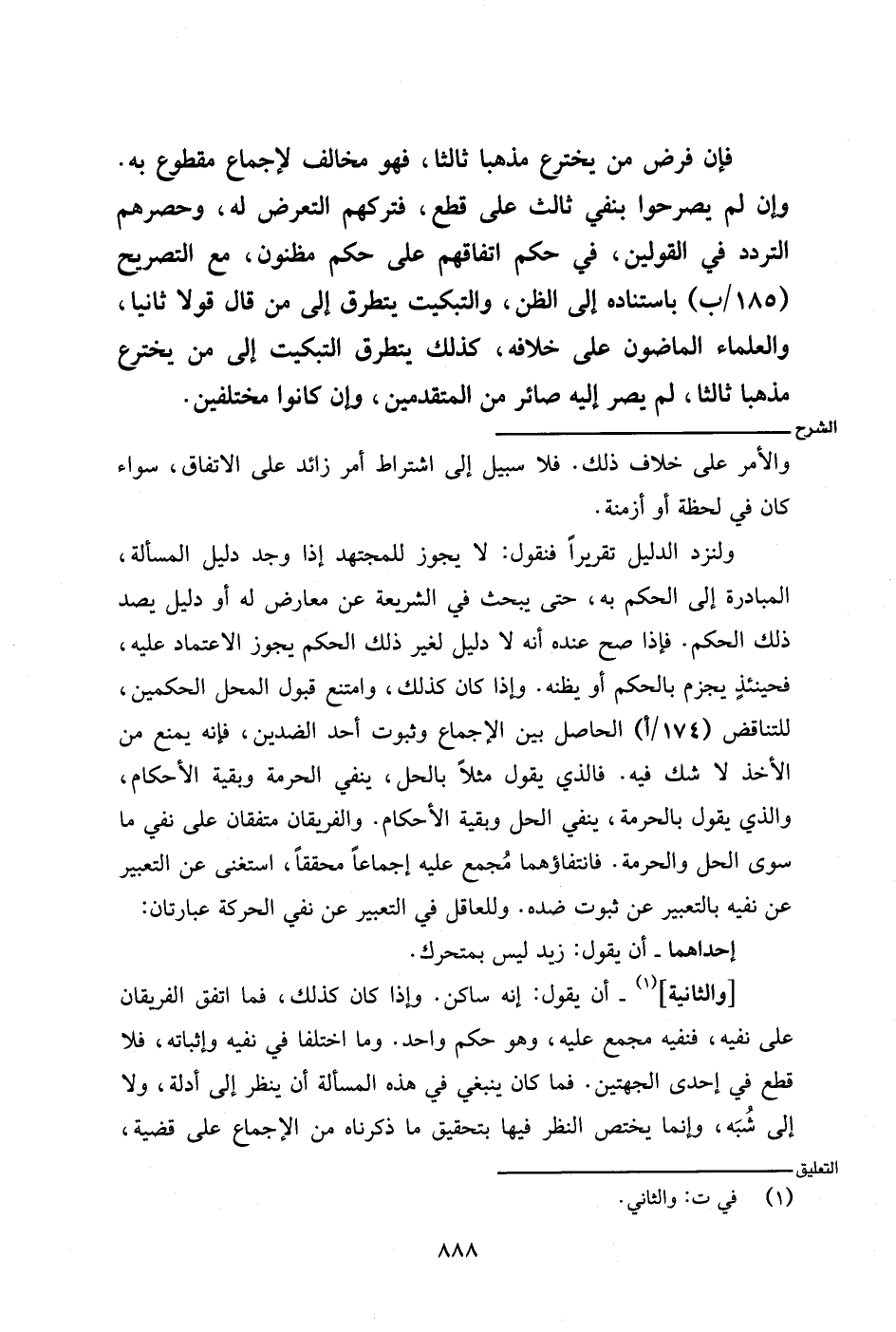 ولنزد الدليل تقريرًا فنقول: لا يجوز للمجتهد إذا وجد دليل المسألة، المبادرة إلى الحكم به، حتى يبحث في الشريعة عن معارض له أو دليل يصد ذلك الحكم. فإذا صح عنده أنه لا دليل لغير ذلك الحكم يجوز الاعتماد عليه، فحينئذٍ يجزم بالحكم أو يظنه. وإذا كان كذلك، وامتنع قبول المحل الحكمين، للتناقض (١٧٤/أ) الحاصل بين الإجماع وثبوت أحد الضدين، فإنه يمنع من الأخذ لا شك فيه. فالذي يقول مثلاً بالحل، ينفي الحرمة وبقية الأحكام، والذي يقول بالحرمة، ينفي الحل وبقية الأحكام. والفريقان متفقان على نفي ما سوى الحل والحرمة. فانتفاؤهما مجمع عليه إجماعًا محققًا، استغنى عن التعبير عن نفيه بالتعبير عن ثبوت ضده. وللعاقل في التعبير عن نفي الحركة عبارتان: