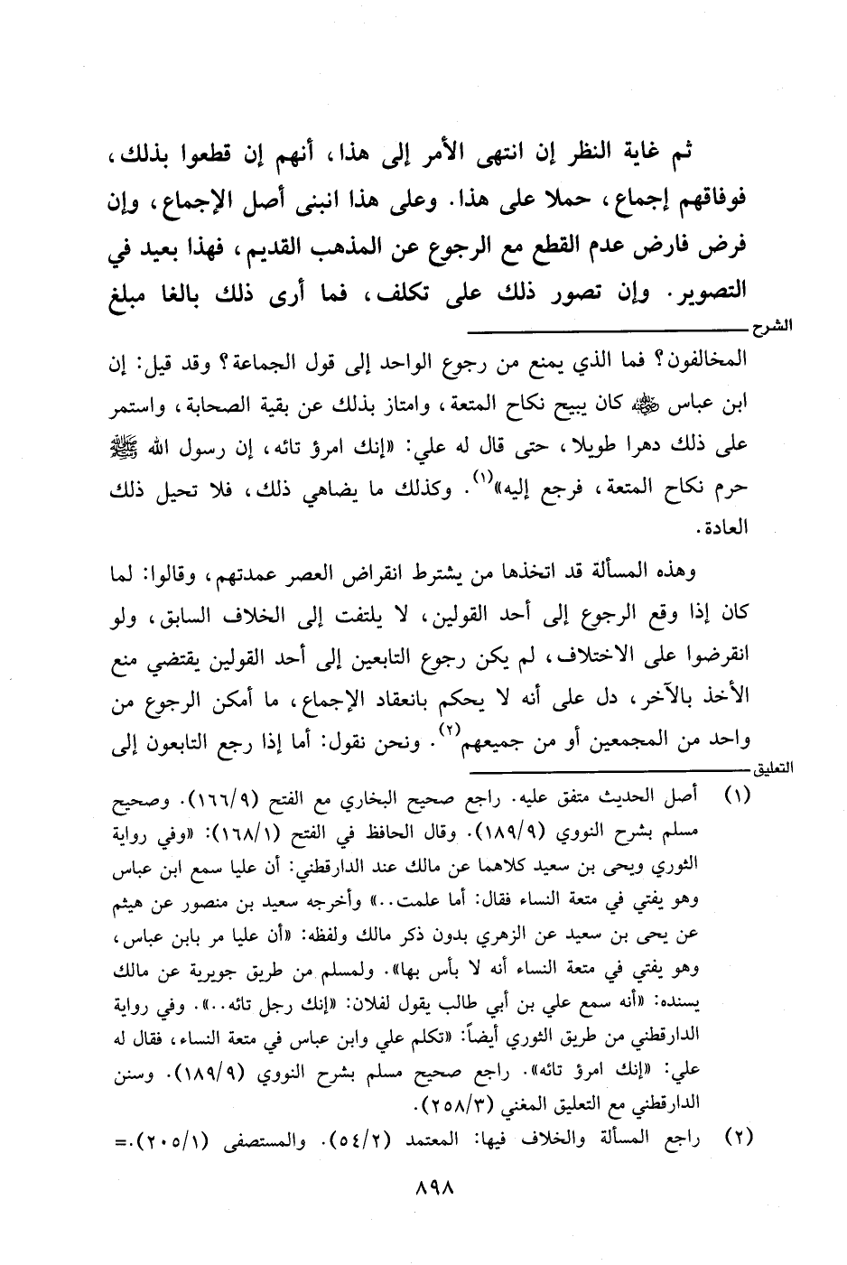 المخالفون؟ فما الذي يمنع من رجوع الواحد إلى قول الجماعة؟ وقد قيل: إن ابن عباس - رضي الله عنه - كان يبيح نكاح المتعة، وامتاز بذلك عن بقية الصحابة، واستمر على ذلك دهرا طويلا، حتى قال له علي: (إنك امرؤ تائه، إن رسول الله - صلى الله عليه وسلم - حرم نكاح المتعة، فرجع إليه). وكذلك ما يضاهي ذلك، فلا تحيل ذلك العادة.