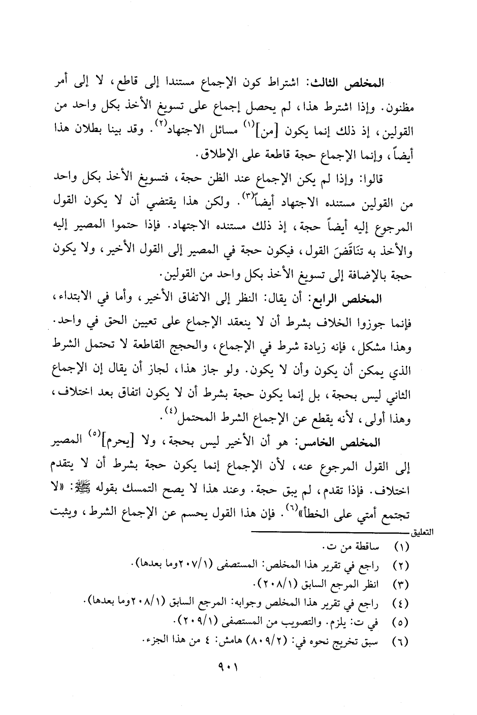 المخلص الثالث: اشتراط كون الإجماع مستندا إلى قاطع، لا إلى أمر مظنون. وإذا اشترط هذا، لم يحصل إجماع على تسويغ الأخذ بكل واحد من القولين، إذ ذلك إنما يكون [من] مسائل الاجتهاد. وقد بينا بطلان هذا أيضًا، وإنما الإجماع حجة قاطعة على الإطلاق.