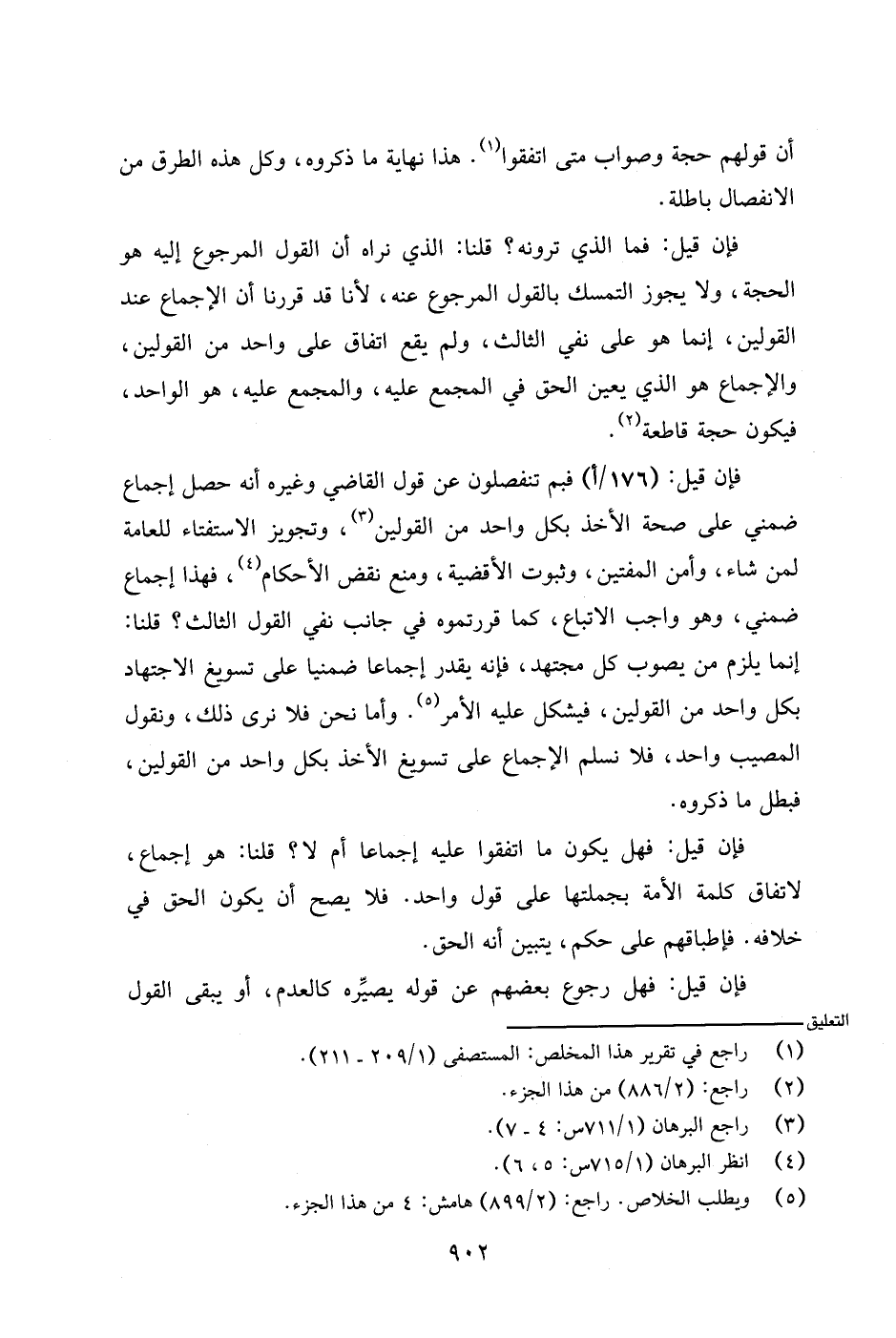 فإن قيل: فما الذي ترونه؟ قلنا: الذي نراه أن القول المرجوع إليه هو الحجة، ولا يجوز التمسك بالقول المرجوع عنه، لأنا قد قررنا أن الإجماع عند القولين، إنما هو على نفي الثالث، ولم يقع اتفاق على واحد من القولين، والإجماع هو الذي يعين الحق في المجمع عليه، والمجمع عليه، هو الواحد، فيكون حجة قاطعة.