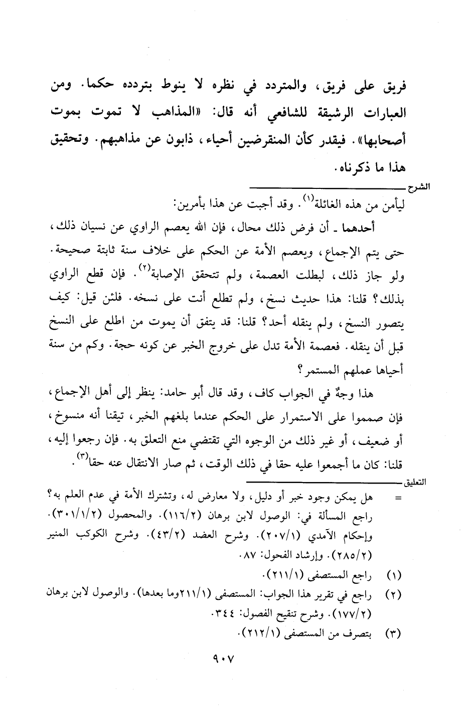 أحدهما - أن فرض ذلك محالن فإن الله يعصم الراوي عن نسيان ذلك، حتى يتم الإجماع، ويعصم الأمة عن الحكم على خلاف سنة ثابتة صحيحة. ولو جاز ذلك، لبطلت العصمة، ولم تتحقق الإصابة. فإن قطع الراوي بذلك؟ قلنا: هذا حديث نسخ، ولم تطلع أنت على نسخه. فلئن قيل: كيف يتصور النسخ، ولم ينقله أحد؟ قلنا: قد يتفق أن يموت من اطلع على النسخ قبل أن ينقله. فعصمة الأمة تدل على خروج الخبر عن كونه حجة. وكم من سنة أحياها عملهم المستمر؟