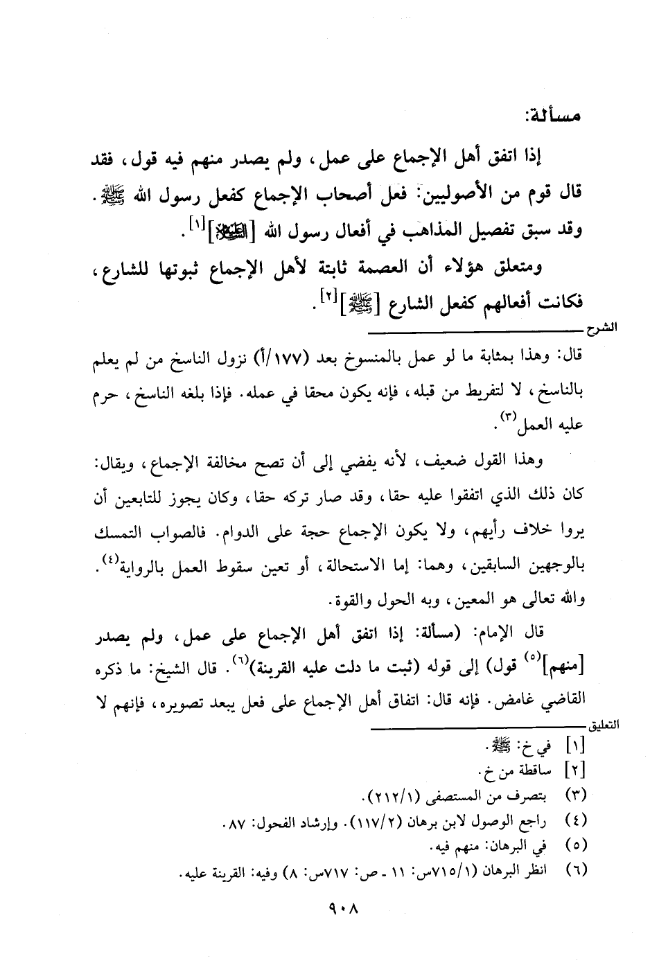 قال الإمام: (مسألة: إذا اتفق أهل الإجماع على عمل، ولم يصدر [منهم] قول) إلى قوله (ثبت ما دلت عليه القرينة). قال الشيخ: ما ذكره القاضي غامض. فإنه قال: اتفاق أهل الإجماع على فعل يبعد تصويره، فإنهم لا