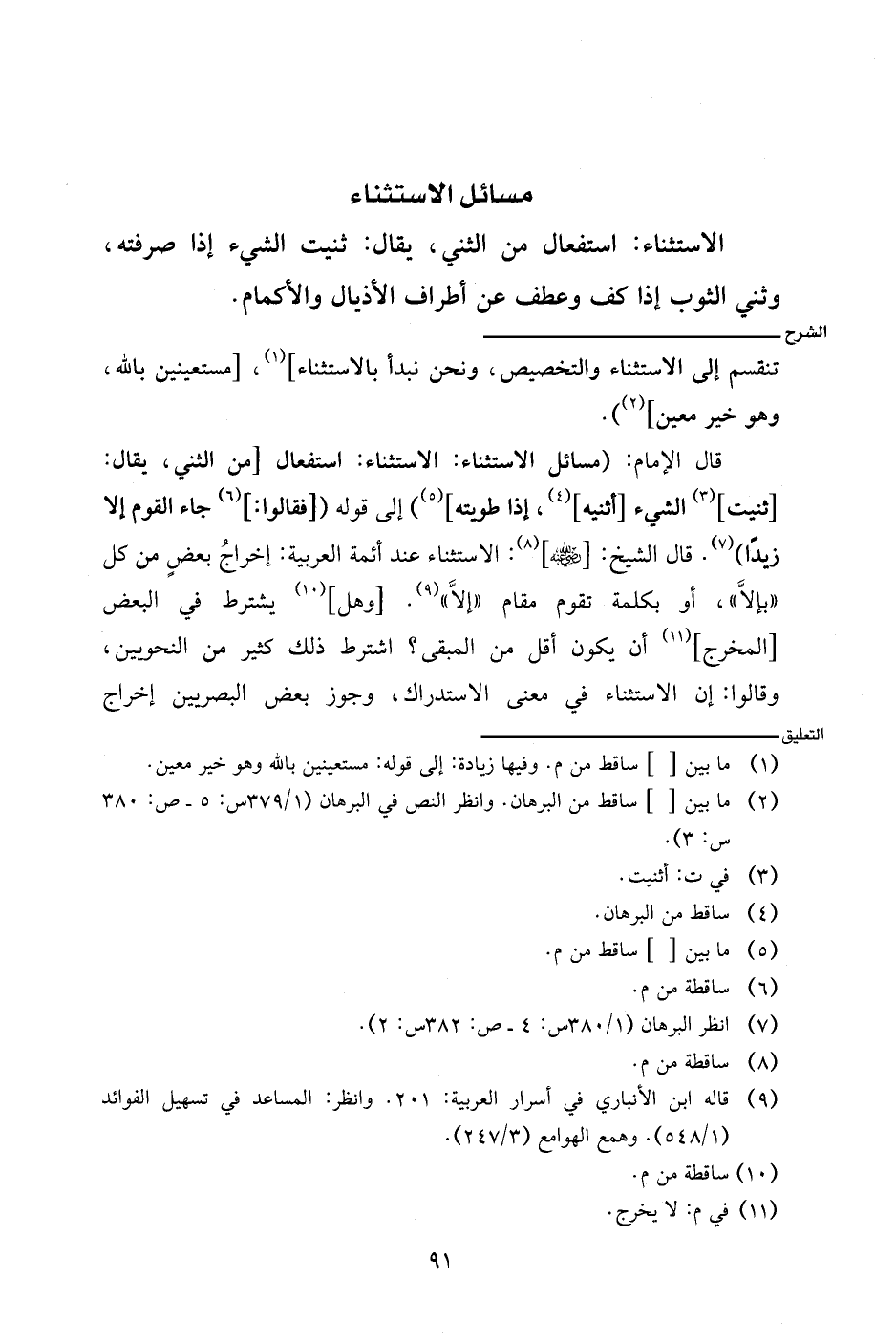 تنقسم إلى الاستثناء والتخصيص، ونحن نبدأ بالاستثناء]، [مستعينين بالله، وهو خير معين]).