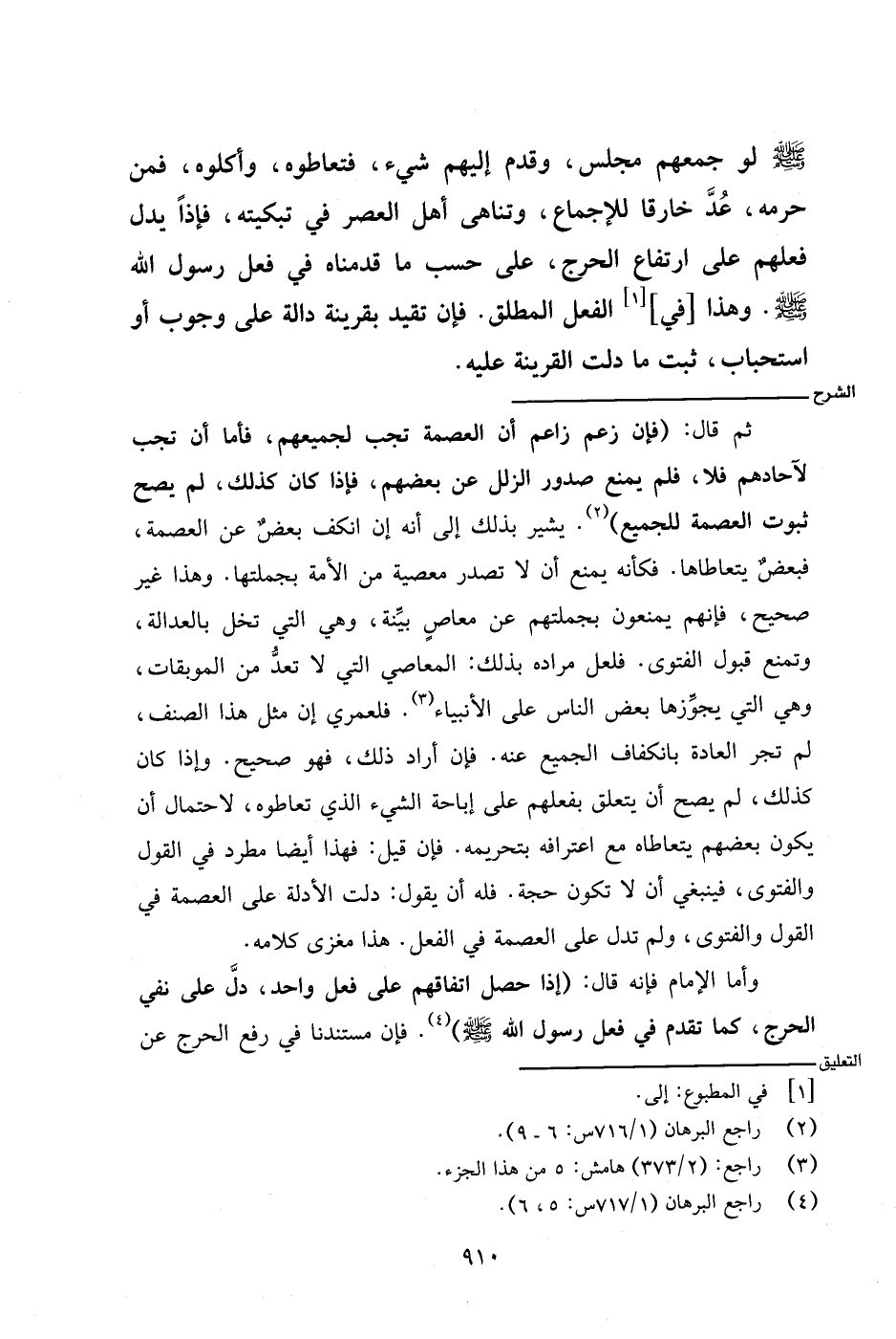 ثم قال: (فإن زعم زاعم أن العصمة تجب لجمعيهم، فأما أن تجب لآحادهم فلا، فلم يمنع صدور الزلل عن بعضهم، فإذا كان كذلك، لم يصح ثبوت العصمة للجميع). يشير بذلك إلى أنه إن انكف بعض عن العصمة، فبعض يتعاطاها. فكأنه يمنع أن لا تصدر معصية من الأمة بجملتها. وهذا غير صحيح، فإنه يمنعون بجملتهم عن معاصٍ بينة، وهي التي تخل بالعدالة، وتمنع قبول الفتوى. فلعل مراده بذلك: المعاصي التي لا تعد من الموبقات، وهي التي يجوزها بعض الناس على الأنبياء. فلعمري إن مثل هذا الصنف، لم تجر العادة بانكفاف الجميع عنه. فإن أراد ذلك، فهو صحيح. وإذا كان كذلك، لم يصح أن يتعلق بفعلهم على إباحة الشيء الذي تعاطوه، لاحتمال أن يكون بعضهم يتعاطاه مع اعترافه بتحريمه. فإن قيل: فهذا أيضا مطرد في القول والفتوى، فينبغي أن لا تكون حجة. فله أن يقول: دلت الأدلة على العصمة في القول والفتوى، ولم تدل على العصمة في الفعل. هذا مغزى كلامه.