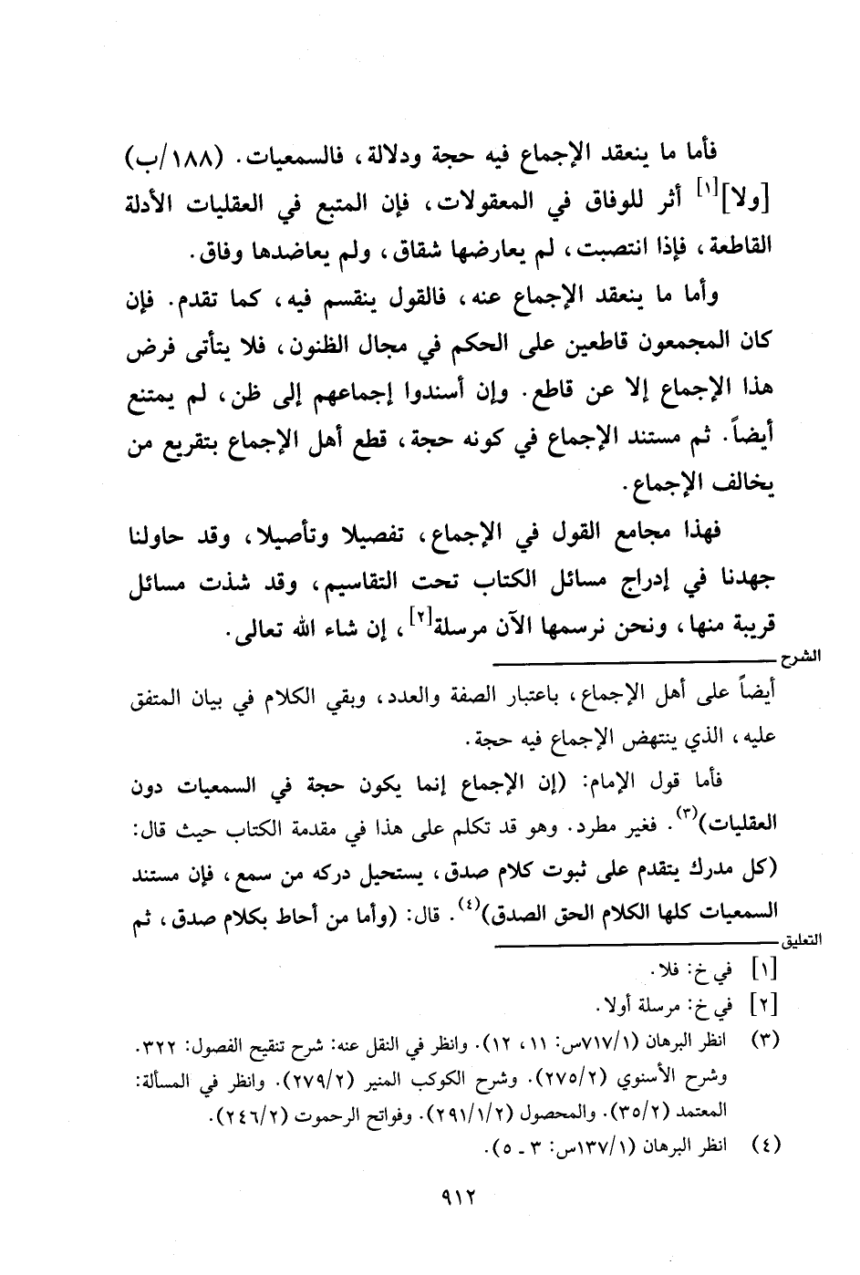 فأما قول الإمام: (إن الإجماع إنما يكون حجة في السمعيات دون العقليات). فغير مطرد. وهو قد تكلم على هذا في مقدمة الكتاب حيث قال: (كل مدرك يتقدم على ثبوت كلام صدق، يستحيل دركه من سمع، فإن مستند السمعيات كلها الكلام الحق الصدق). قال: (وأما من أحاط بكلام صدق، ثم