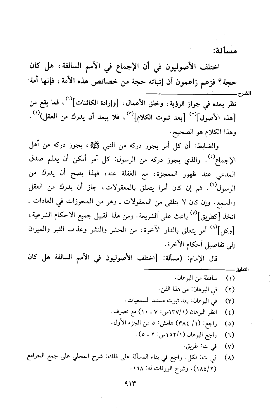 والضابط: أن كل أمر يجوز دركه من النبي - صلى الله عليه وسلم -، يجوز دركه من أهل الإجماع. والذي يجوز دركه من الرسول: كل أمر أمكن أن يعلم صدق المدعي عند ظهور المعجزة، مع الغفلة عنه، فهذا يصح أن يدرك من الرسول. ثم إن كان أمرا يتعلق بالمعقولات، جاز أن يدرك من العقل والسمع. وإن كان لا يتلقى من المعقولات - وهو من المجوزات في العادات - اتخذ [كطريق] باعث على الشريعة. ومن هذا القبيل جميع الأحكام الشرعية، [وكل] أمر يتعلق بالدار الآخرة، من الحشر والنشر وعذاب القبر والميزان إلى تفاصيل أحكام الآخرة.