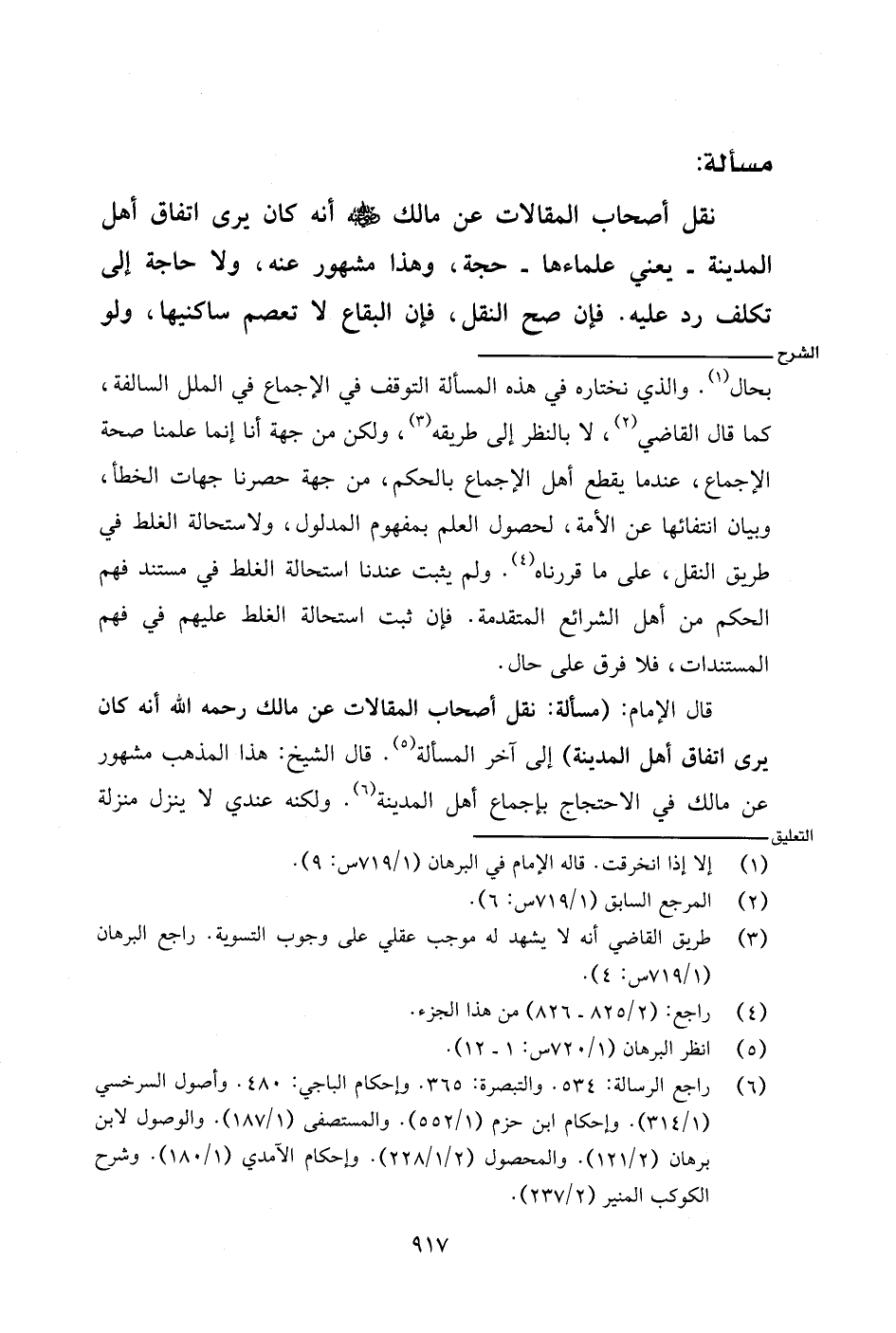 قال الإمام: (مسألة: نقل أصحاب المقالات عن مالك رحمه الله أنه كان يرى اتفاق أهل المدينة) إلى آخر المسألة. قال الشيخ: هذا المذهب مشهور عن مالك في الاحتجاج بإجماع أهل المدينة. ولكنه عندي لا ينزل منزلة