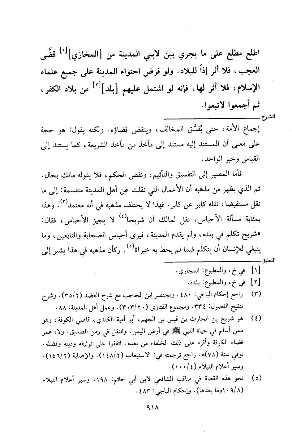 ثم الذي يظهر من مذهبه أن الأعمال التي نقلت عن أهل المدينة منقسمة: إلى ما نقل مستفيضا، نقله كابر عن كابر. فهذا لا يختلف مذهبه في أنه معتمد. وهذا بمثابة مسألة الأحباس، نقل لمالك أن شريحا لا يجيز الأحباس، فقال: (شريح تكلم في بلده، ولم يقدم المدينة، فيرى أحباس الصحابة والتابعين، وما ينبغي للإنسان أن يتكلم فيما لم يحط به خبرا). وكأن مذهبه في هذا يشير إلى