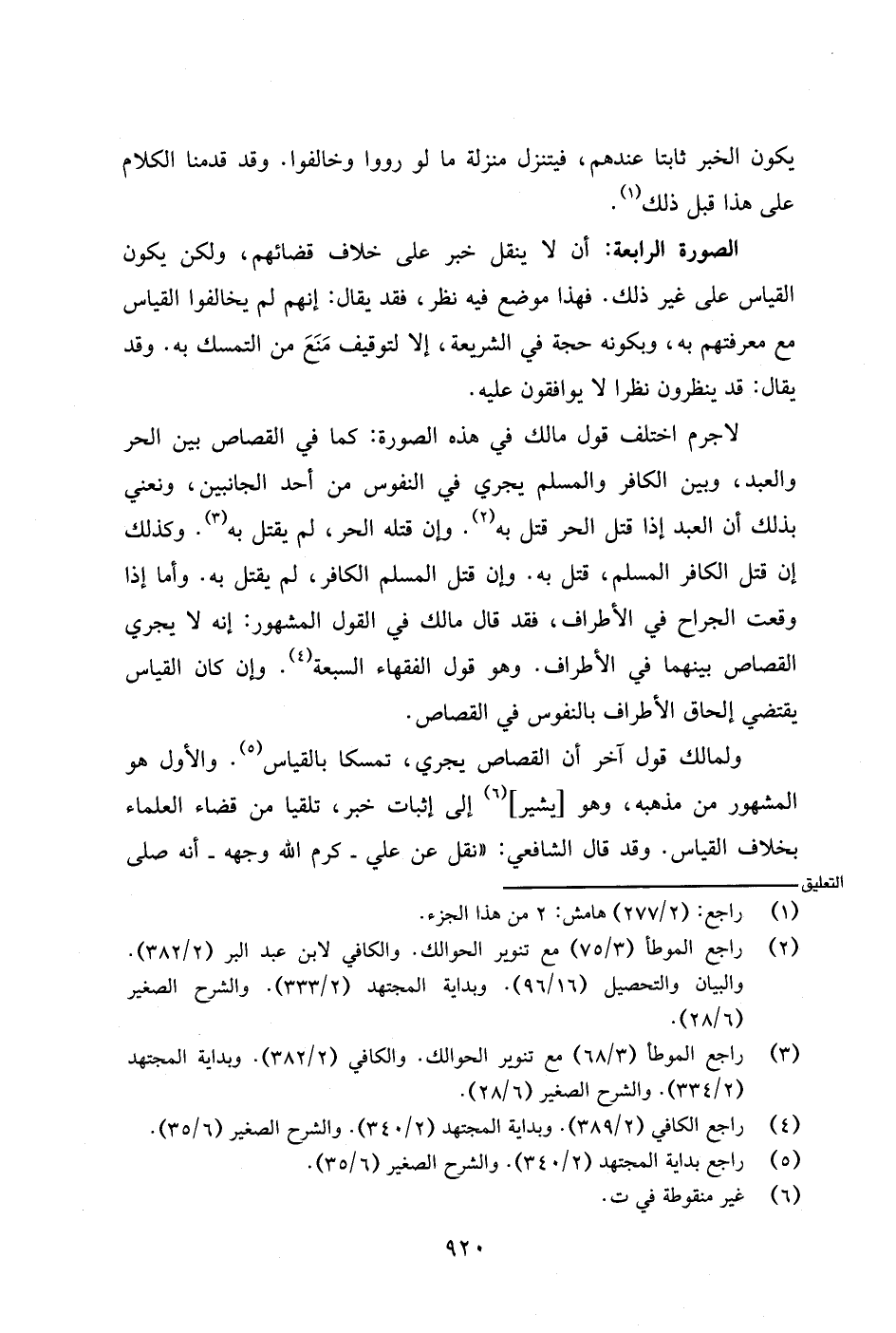 ولمالك قول آخر أن القصاص يجري، تمسكا بالقياس. والأول هو المشهور من مذهبه، وهو [يشير] إلى إثبات خبر، تلقيا من قضاء العلماء بخلاف القياس. وقد قال الشافعي: (نقل عن علي - كرم الله وجهه - أنه صلى