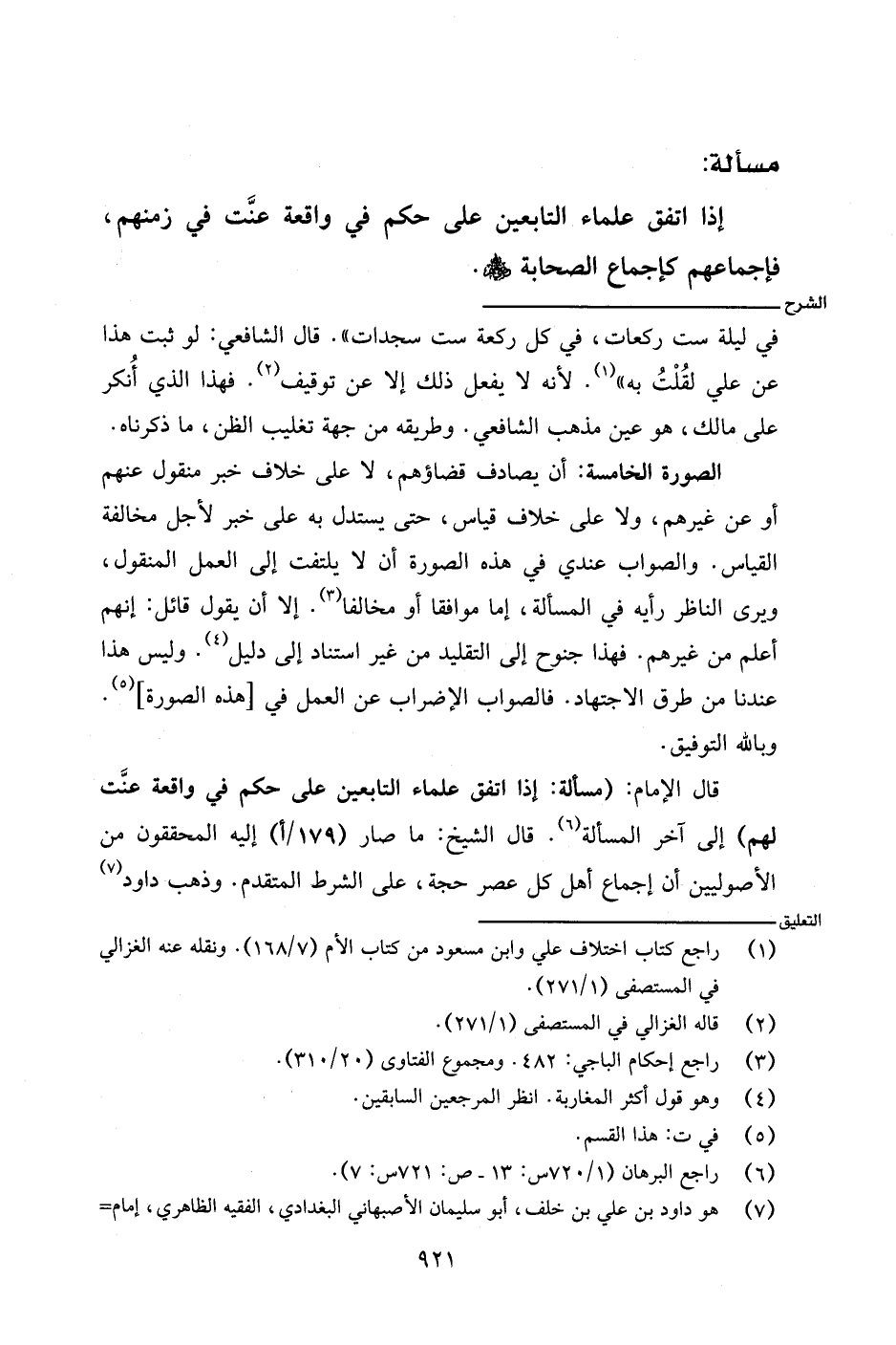 قال الإمام: (مسألة: إذا اتفق علماء التابعين على حكم في واقعة عنت لهم) إلى آخر المسألة. قال الشيخ: ما صار (١٧٩/أ) إليه المحققون من الأصوليين أن إجماع أهل كل عصر حجة، على الشرط المتقدم. وذهب داود