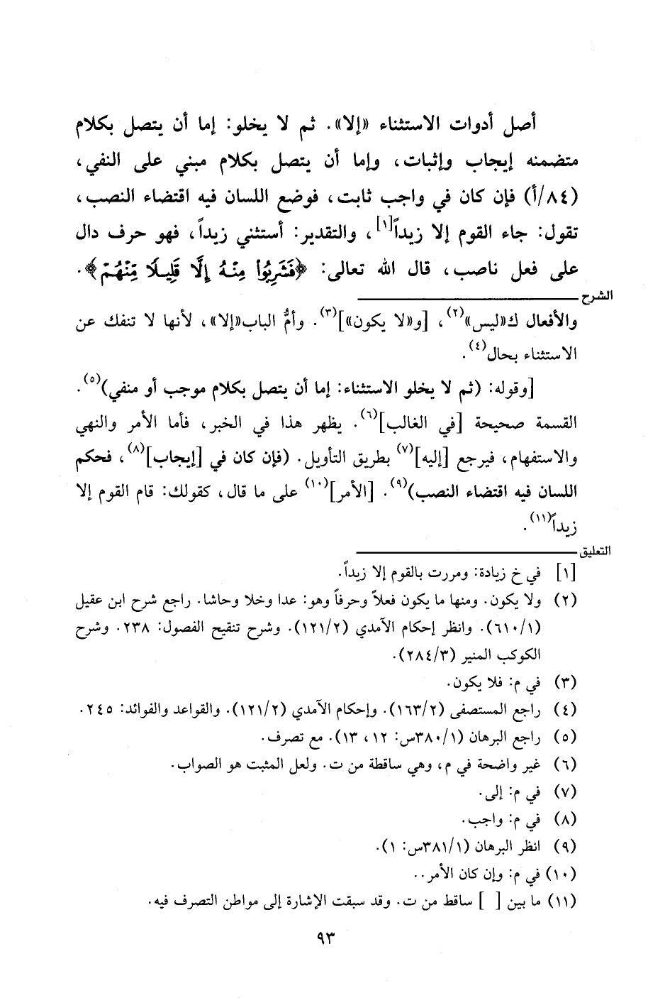 [وقوله: (ثم لا يخلو الاستثناء: إما أن يتصل بكرم موجب أو منفي). القسمة صحيحة [في الغالب]. يظهر هذا في الخبر، فأما الأمر والنهي والاستفهام، فيرجع [إليه] بطريق التأويل. (فإن كان في [إيجاب]، فكم اللسان فيه اقتضاء النصب). [الأمر] على ما قال، كقولك: قام القوم إلا زيدًا.