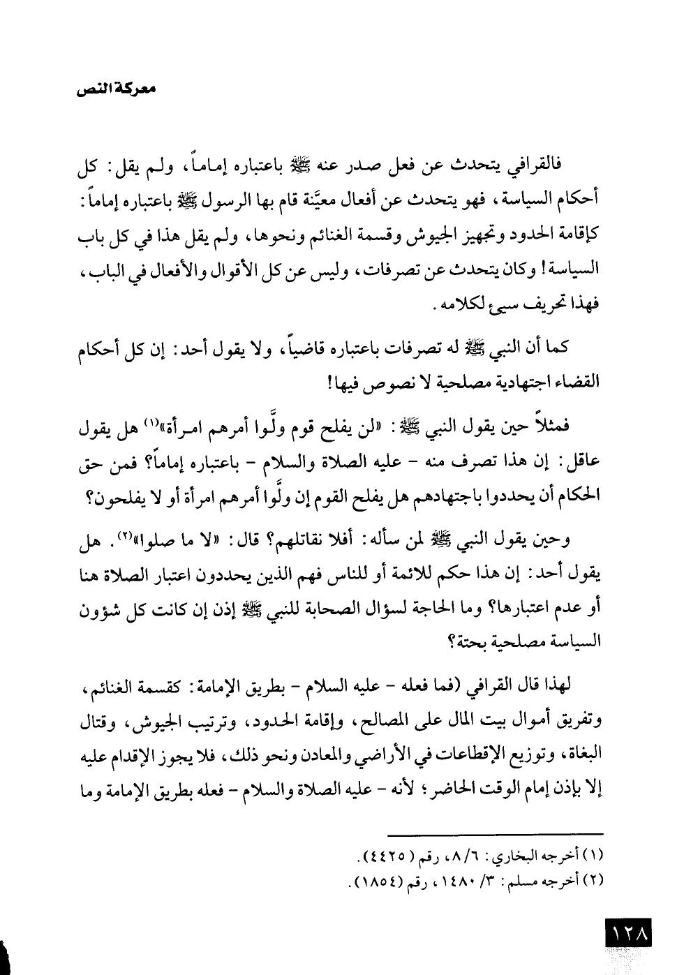 فالقرافي يتحدث عن فعل صدر عنه -صلى اللَّه عليه وسلم- باعتباره إمامًا، ولم يقل: كل أحكام السياسة، فهو يتحدث عن أفعال معتنة قام بها الرسول -صلى اللَّه عليه وسلم- باعتباره إمامًا: كإقامة الحدود وتجهيز الجيوش وقسمة الغنائم ونحوها، ولم يقل هذا في كل باب السياسة! وكان يتحدث عن تصرفات، وليس عن كل الأقوال والأفعال في الباب، فهذا تحريف سيئ لكلامه.
