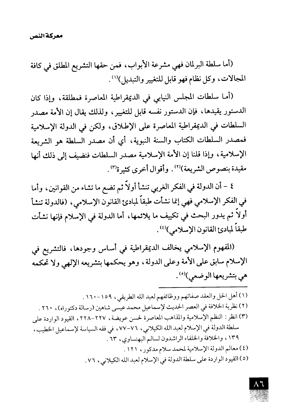 (¬3) انظر: النظم الإسلامية والمذاهب المعاصرة لحسن عويضة، 227 - 228، القيود الواردة على سلطة الدولة في الإسلام لعبد اللَّه الكيلاني، 76 - 77، في فقه السياسة لإسماعيل الخطيب، 139، والخلافة والخلفاء الراشدون لسالم البهنساوي، 63.