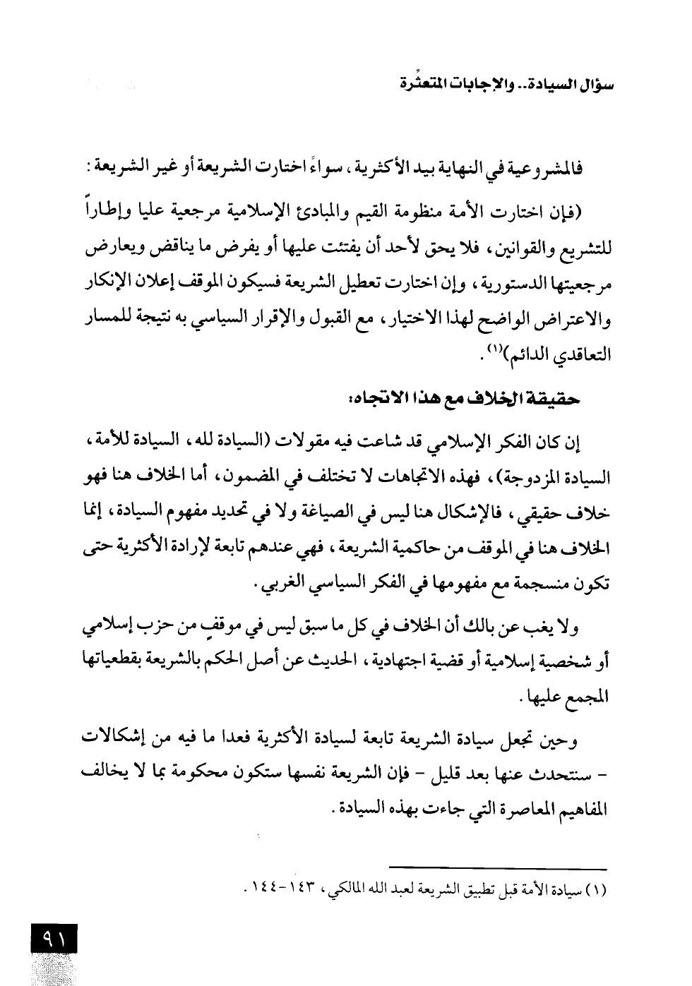 (¬1) سيادة الأمة قبل تطبيق الشريعة لعبد اللَّه المالكي، 143 - 144.