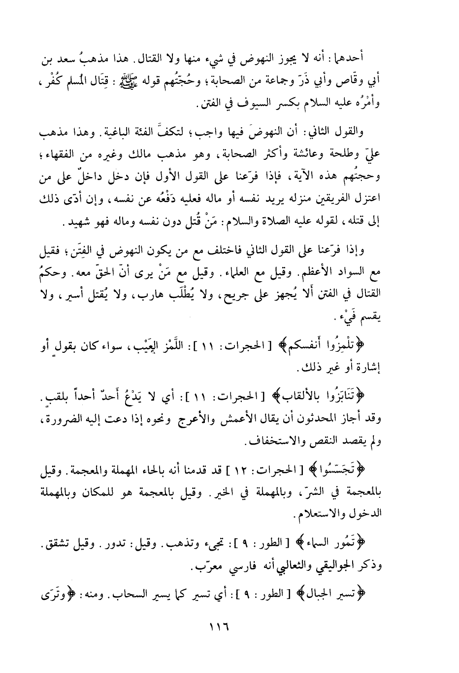 هذا مذهب سعد بن أيي وقاص وأبي ذَرٍّ وجماعة من الصحابة، وحجّتهم قوله - صلى الله عليه وسلم -: قِتَال المسلم كفْر.
