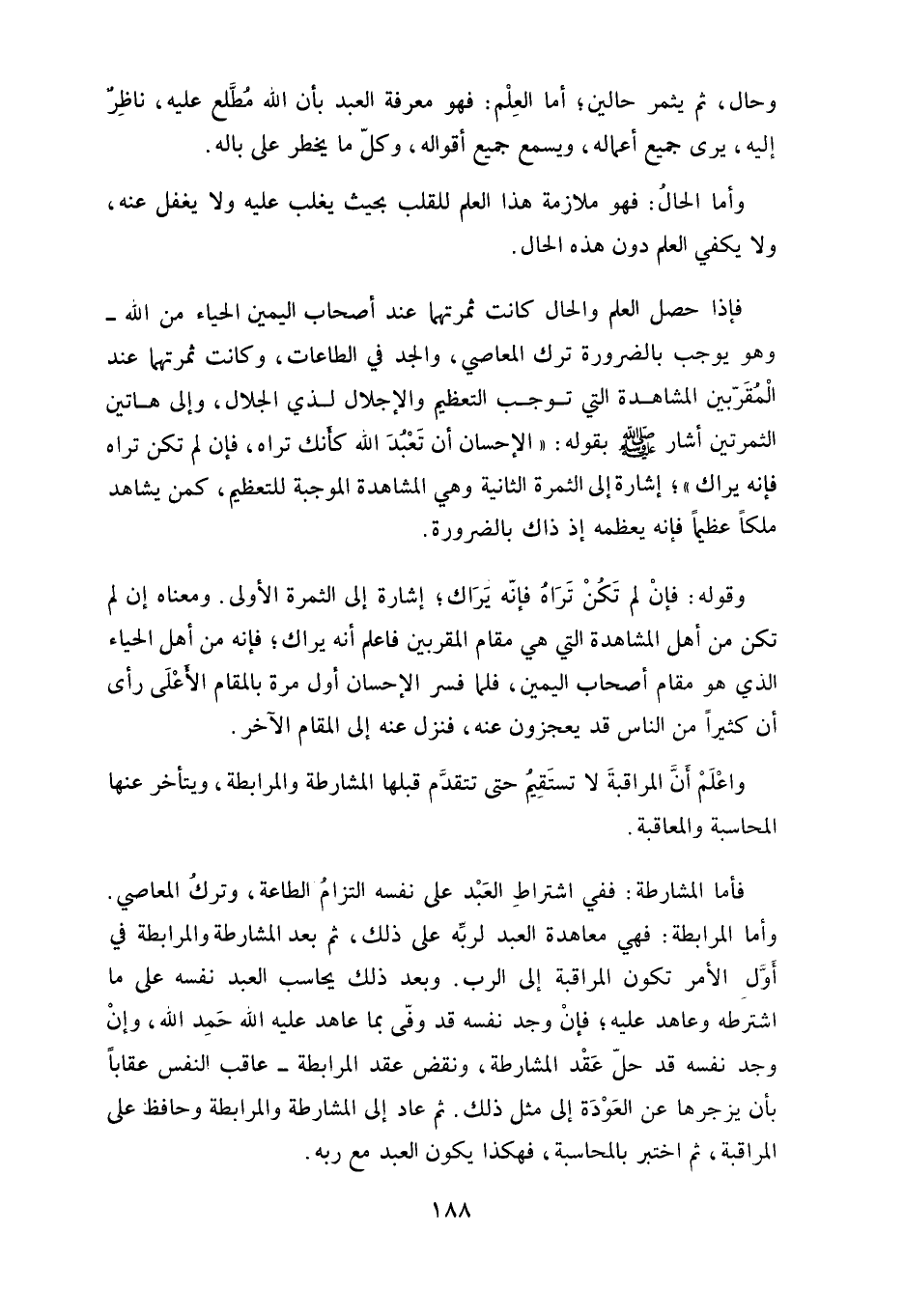 واعْلَم أَنَ المراقبةَ لا تستَقِيم حتى تتقدَّم قبلها المشارطة والمرابطة، ويتأخر عنها