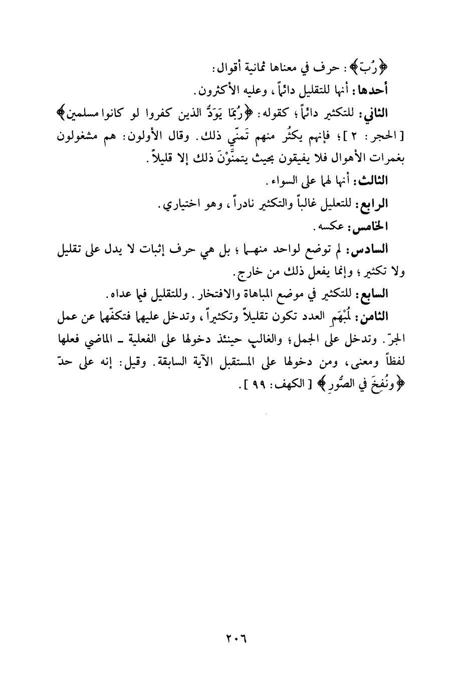 الثاني: للتكثير دائماً، كقوله: (رُبَمَا يَوَدُّ الَّذِينَ كَفَرُوا لَوْ كَانُوا مُسْلِمِينَ) ، فإنهم يكثر منهم تَمنّيِ ذلك.
