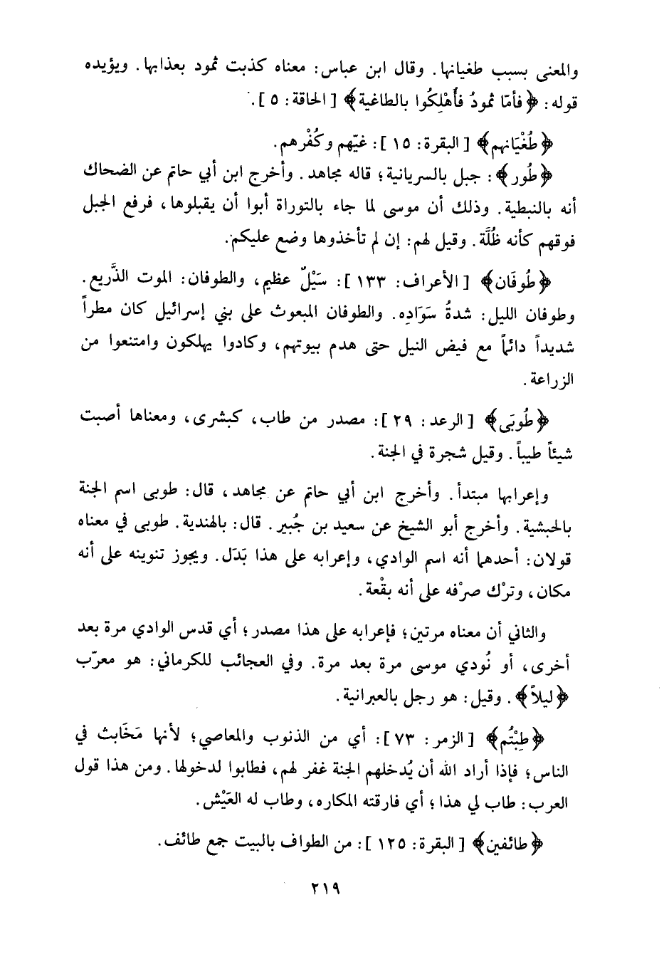 طوبى في معناه قولان: أحدهما أنه اسم الوادي، وإعرابه على هذا بَدَل.