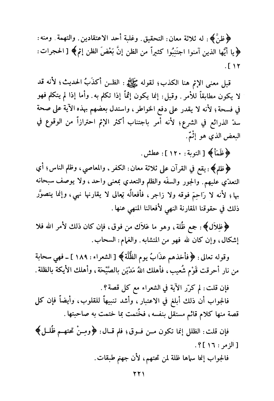 (ظلم) : يقع في القرآن على ثلاثة معان: الكفر، والمعاصي، وظلم الناس، أي التعدّي عليهم.