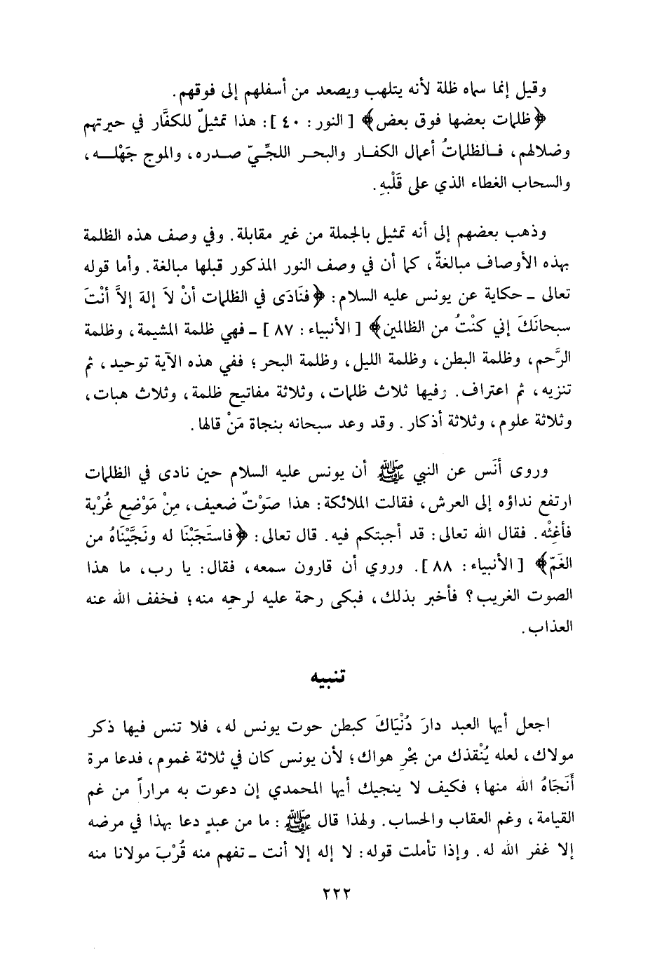 وأما قوله تعالى - حكاية عن يونس عليه السلام: (فَنَادَى فِي الظُّلُمَاتِ أَنْ لَا إِلَهَ إِلَّا أَنْتَ سُبْحَانَكَ إِنِّي كُنْتُ مِنَ الظَّالِمِينَ) - فهي ظلمة المشيمة، وظلمة
