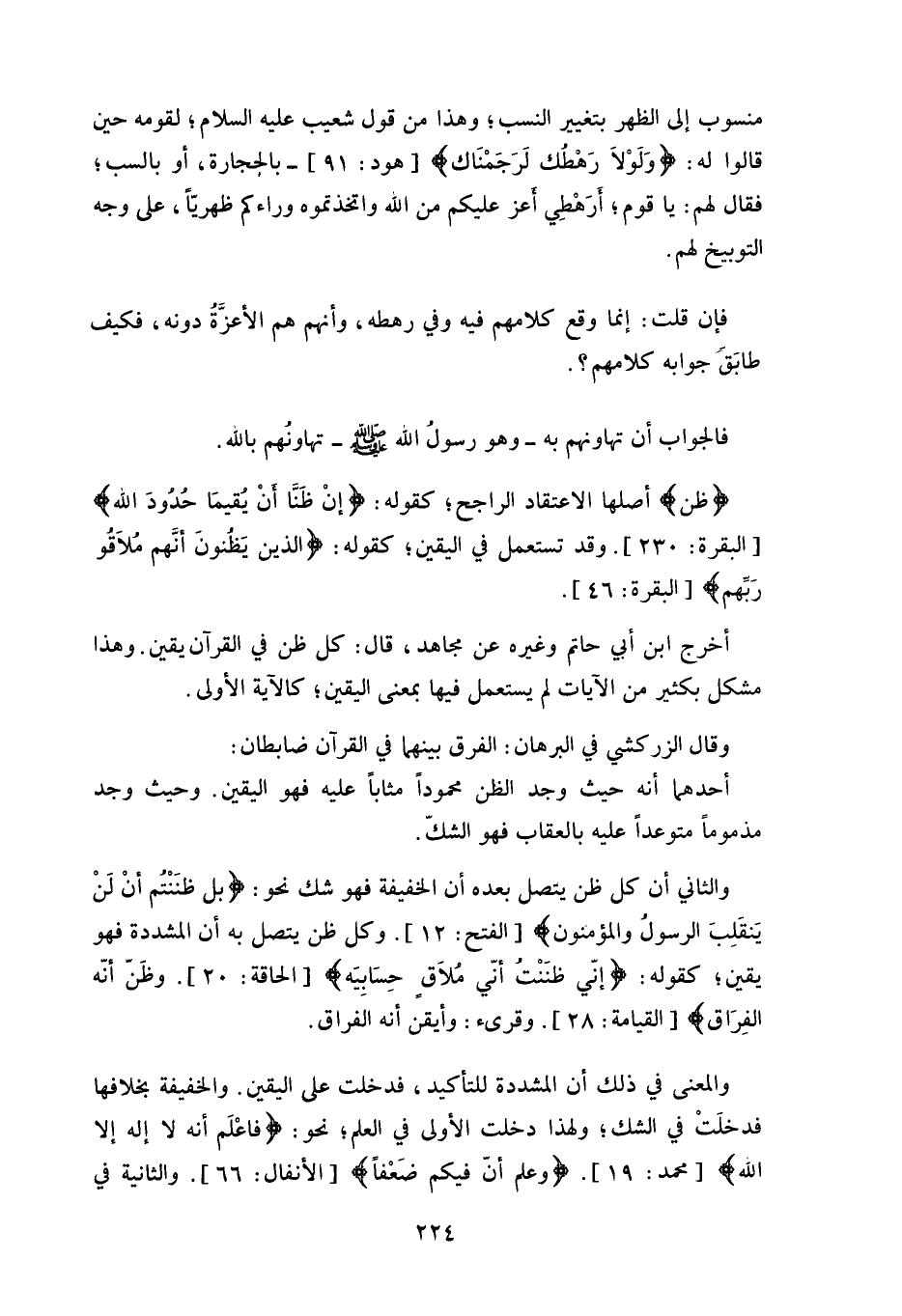 وقد تستعمل في اليقين، كقوله: (الَّذِينَ يَظُنُّونَ أَنَّهُمْ مُلَاقُو رَبِّهِمْ) .