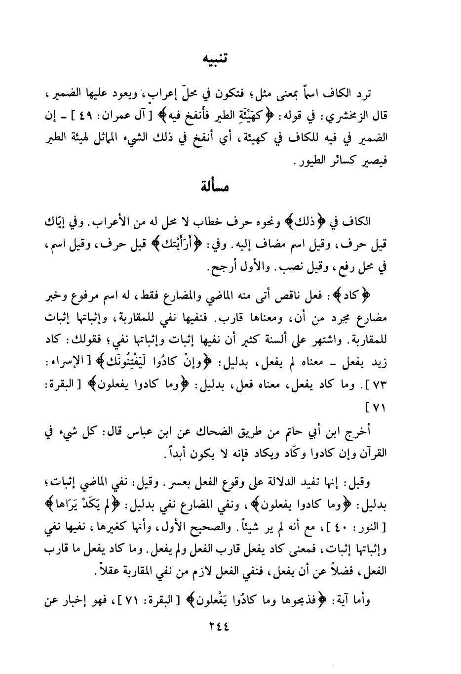 وقيل: نفي الماضي إثبات، بدليل: (وما كادوا يفعلون) ، ونفي المضارع نفي بدليل: (لم يَكَدْ يرَاها) ، مع أنه لم ير شيئاً.