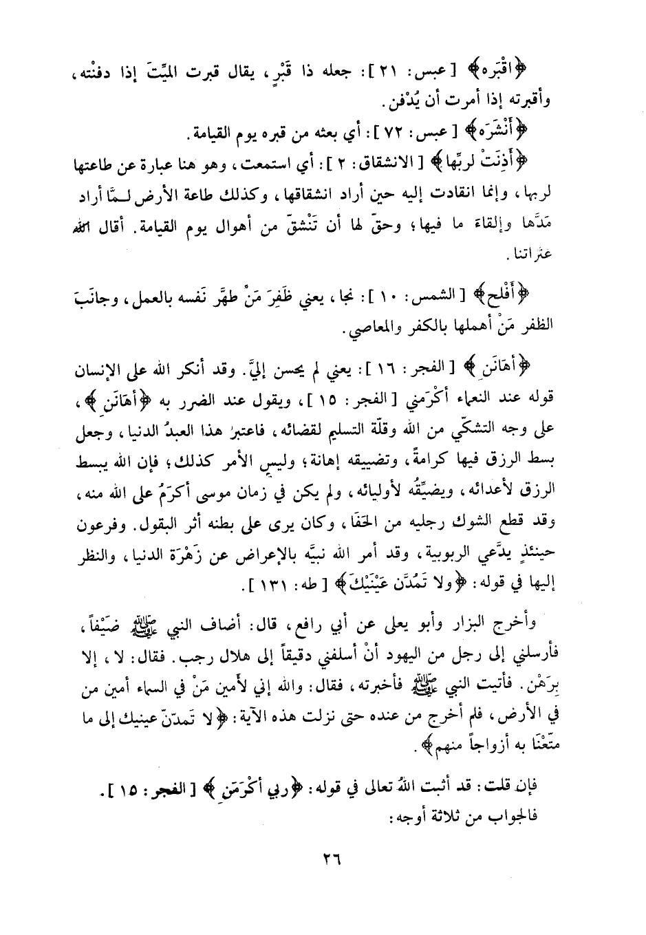 وقد أنكر الله على الإنسان قوله عند النعماء أكْرَمني، ويقول عند الضرر به (أهَانَنِ) ، على وجه التشكي من الله وقلّة التسليم لقضائه، فاعتبر هذا العبد الدنيا، وجعل بسط الرزق فيها كرامة، وتضييقه إهانة، وليس الأمر كذلك، فإن الله يبسط الرزق لأعدائه، ويضيِّقه لأوليائه، ولم يكن في زمان موسى أكرَم على الله منه، وقد قطع الشوك رجليه من الحَفَا، وكان يرى على بطنه أثر البقول.