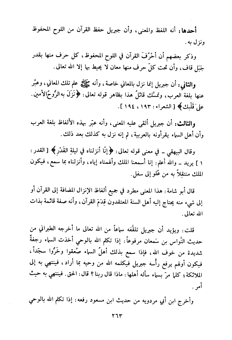 والثاني: أن جبريل إنما نزل بالمعاني خاصة، وأنه - صلى الله عليه وسلم - علم تلك المعاني، وعبَّر عنها بلغة العرب، وتمسَّك قائل هذا بظاهر قوله تعالى: (نَزَلَ بِهِ الرُّوحُ الْأَمِينُ (193) عَلَى قَلْبِكَ) .