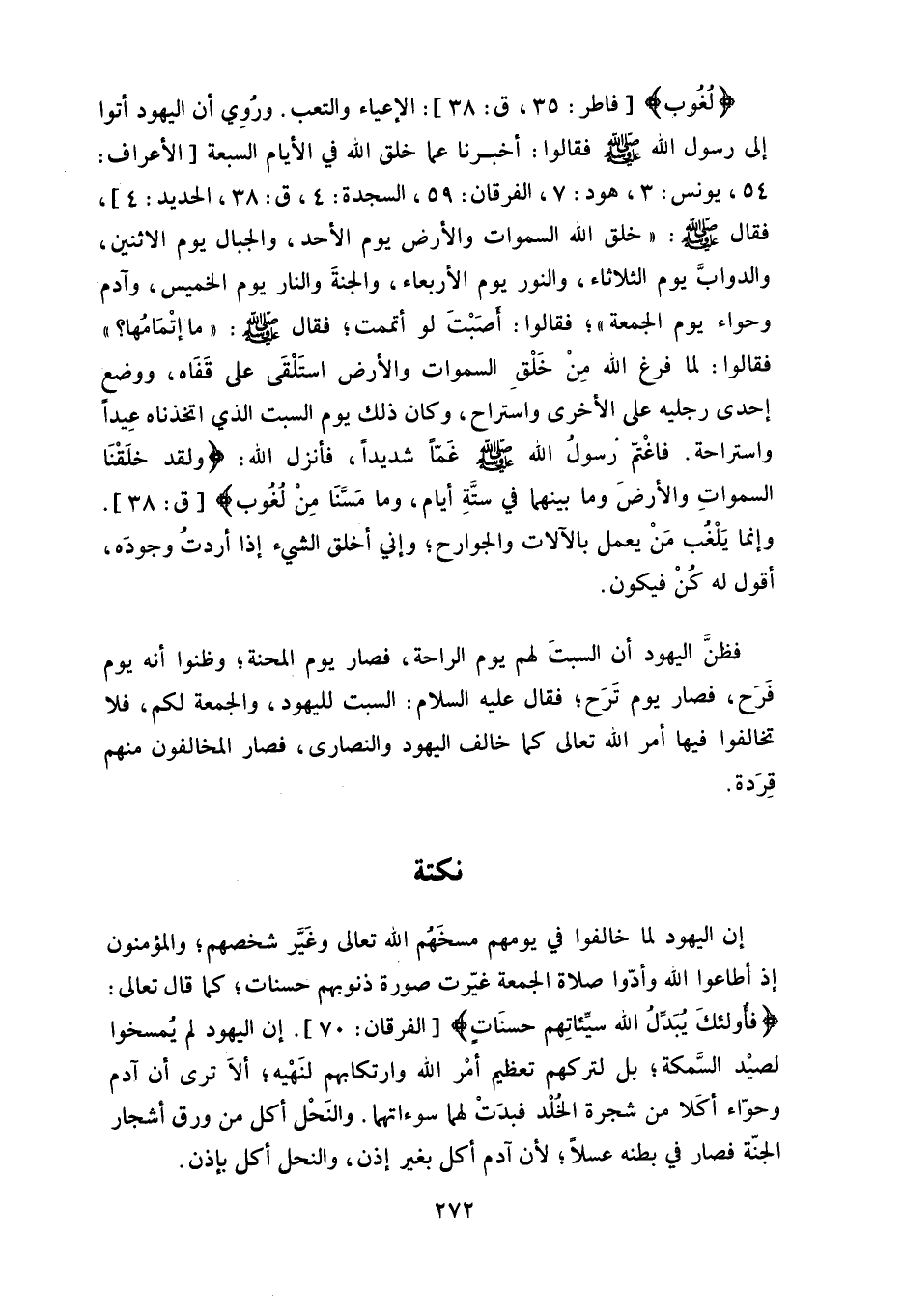 فقال - صلى الله عليه وسلم -: " خلق الله السماوات والأرض يوم الأحد، والجبال يوم الإثنين، والدوابَّ يوم الثلاثاء، والنور يوم الأربعاء، والجنةَ والنار يوم الخميس، وآدم وحواء يوم الجمعة "، فقالوا: أصَبْتَ لو أتممت، فقال - صلى الله عليه وسلم -: " ما إتْمَامُها، "