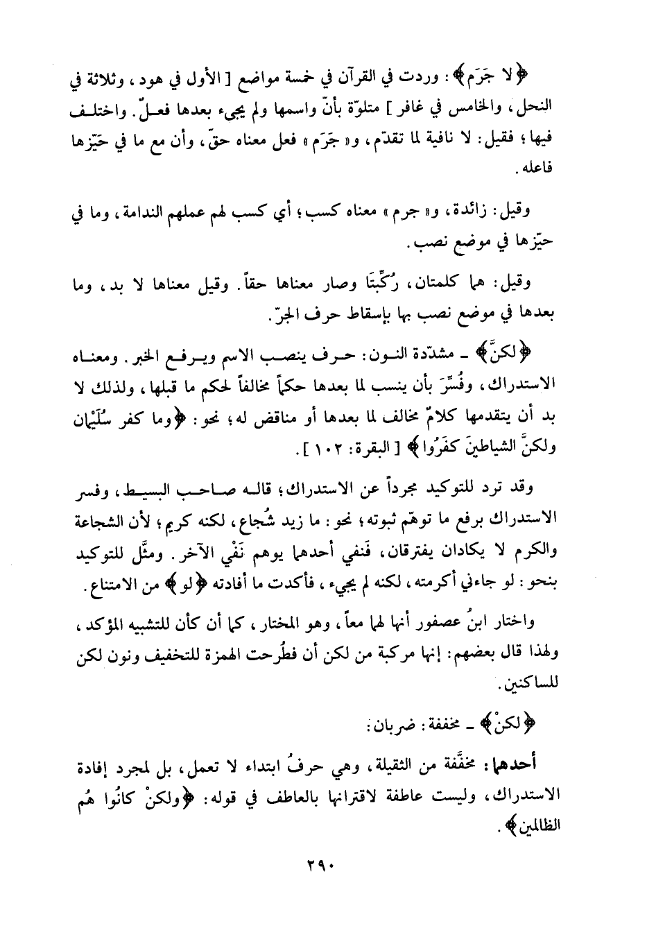 ومعناه الاستدراك، وفُسِّرَ بأن ينسب لما بعدها حكماً مخالفا لحكم ما قبلها، ولذلك لا بد أن يتقدمها كلامٌ مخالف لما بعدها أو مناقض له، نحو: (وما كفر سُلَيْمان ولكنَّ الشياطينَ كفَروا) .