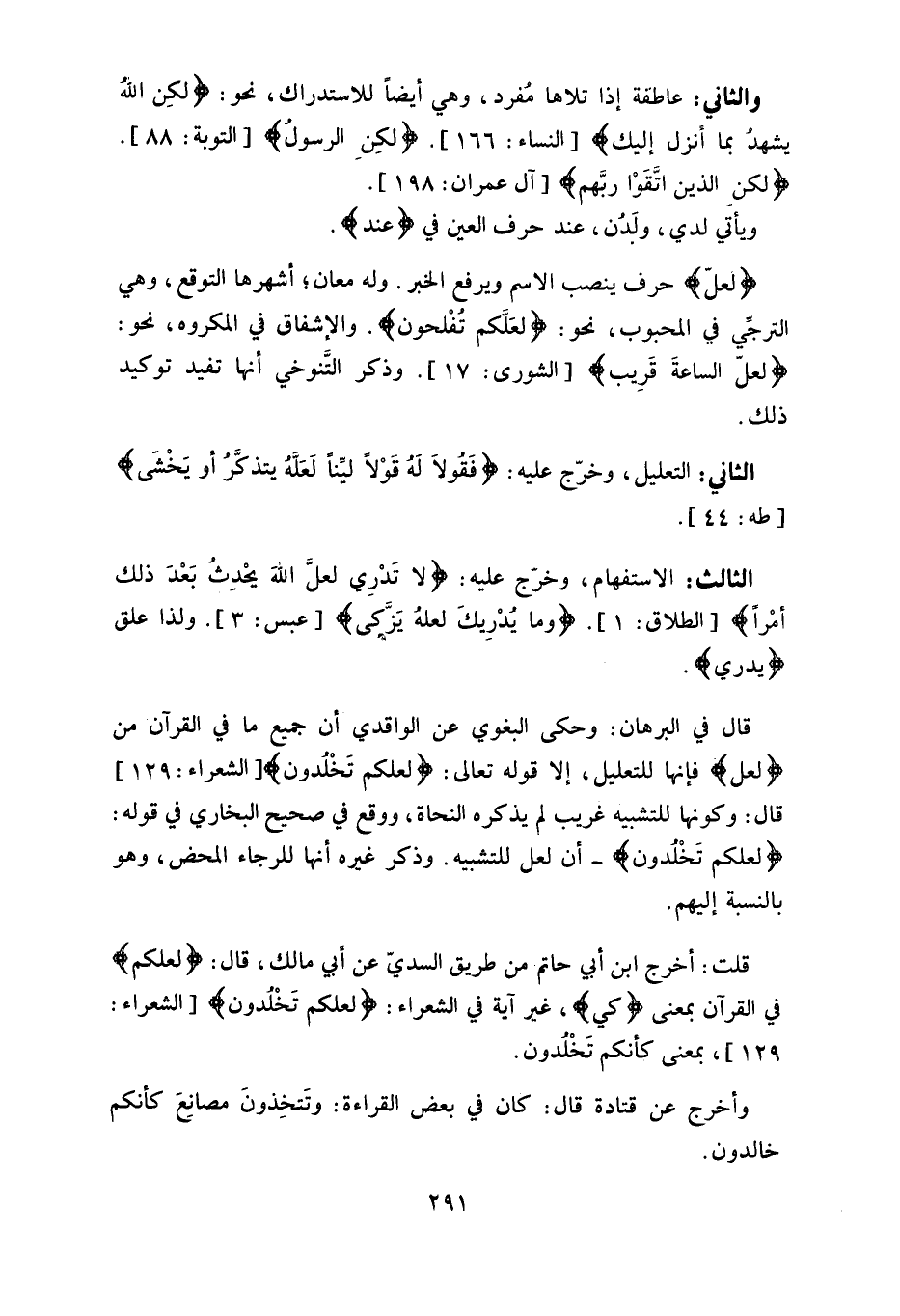 (لعلَّ) فإنها للتعليل، إلا قوله تعالى: (لعلكم تَخْلُدون) .