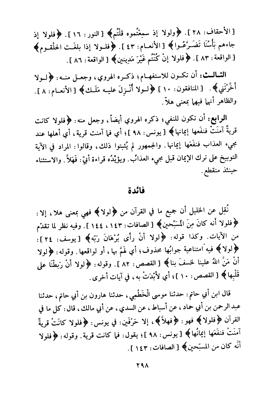 عبد الرحمن بن أبي حماد، عن أسباط، عن السدي، عن أبي مالك، قال: كل ما في القرآن (فلولا) فهو: (فهلاَّ) ، إلا حَرْفَين: في يونس: (فلولا كانَتْ قريةٌ آمنَتْ فنفَعَها إيمانها) ، يقول: فما كانت قرية.