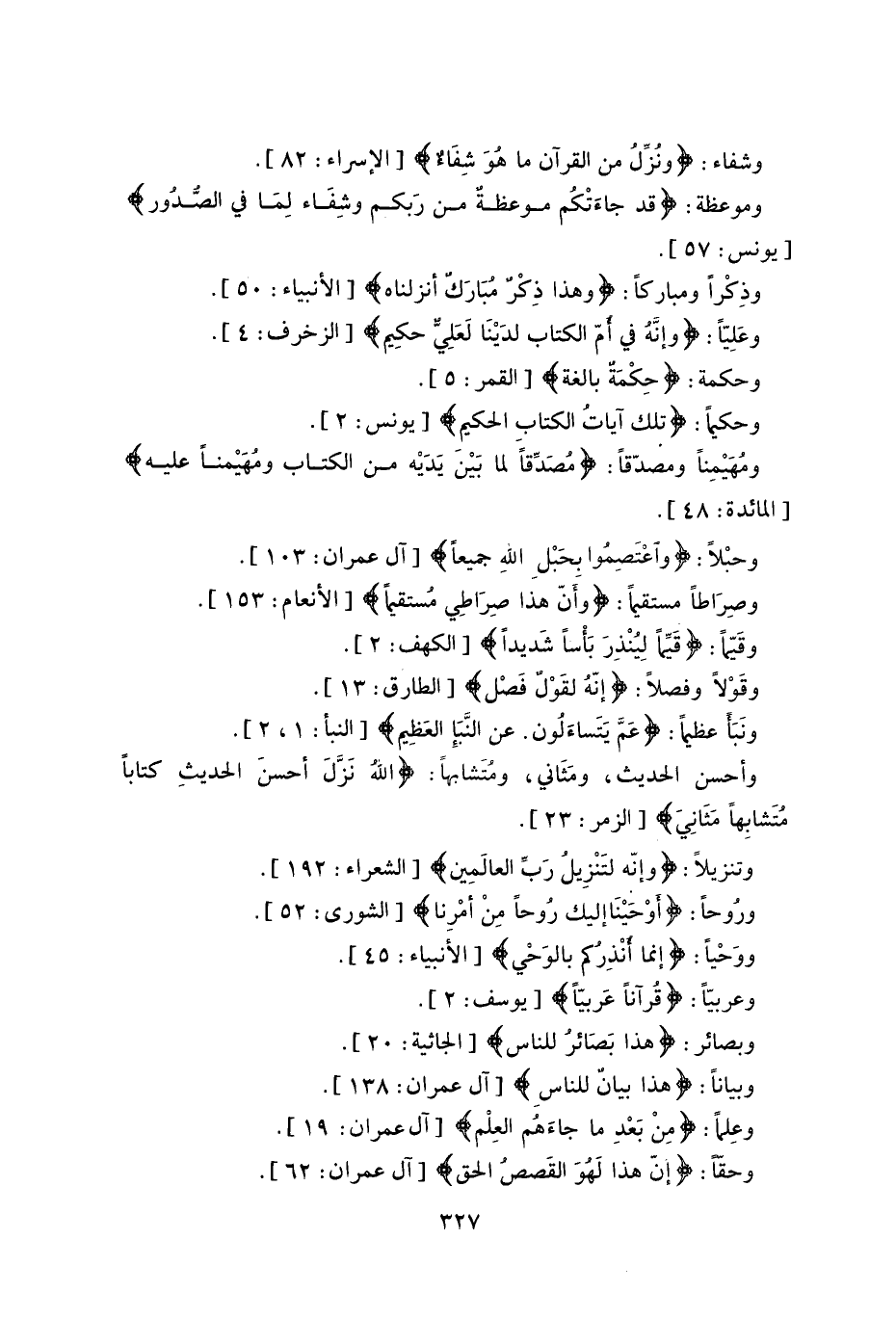 وأحسن الحديث، ومَثَاني، ومتَشابهاً: (اللَّهُ نَزَّلَ أَحْسَنَ الْحَدِيثِ كِتَابًا مُتَشَابِهًا مَثَانِيَ) .