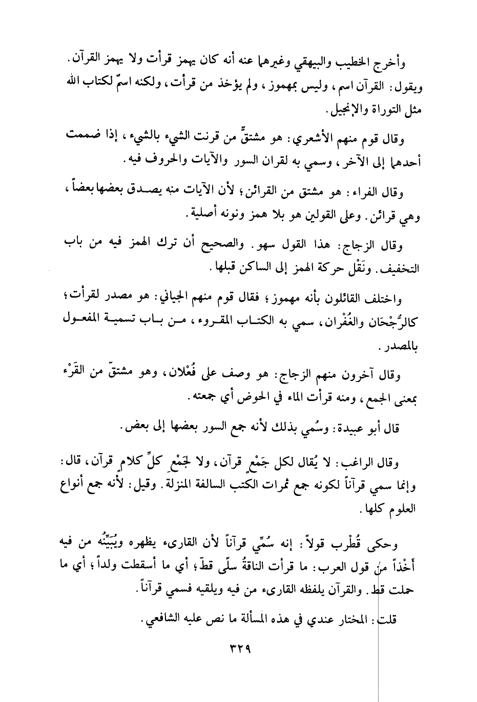 ويقول: القرآن اسم، وليس بمهموز، ولم يؤخذ من قرأت، ولكنه اسمٌ لكتاب الله مثل التوراة والإنجيل.