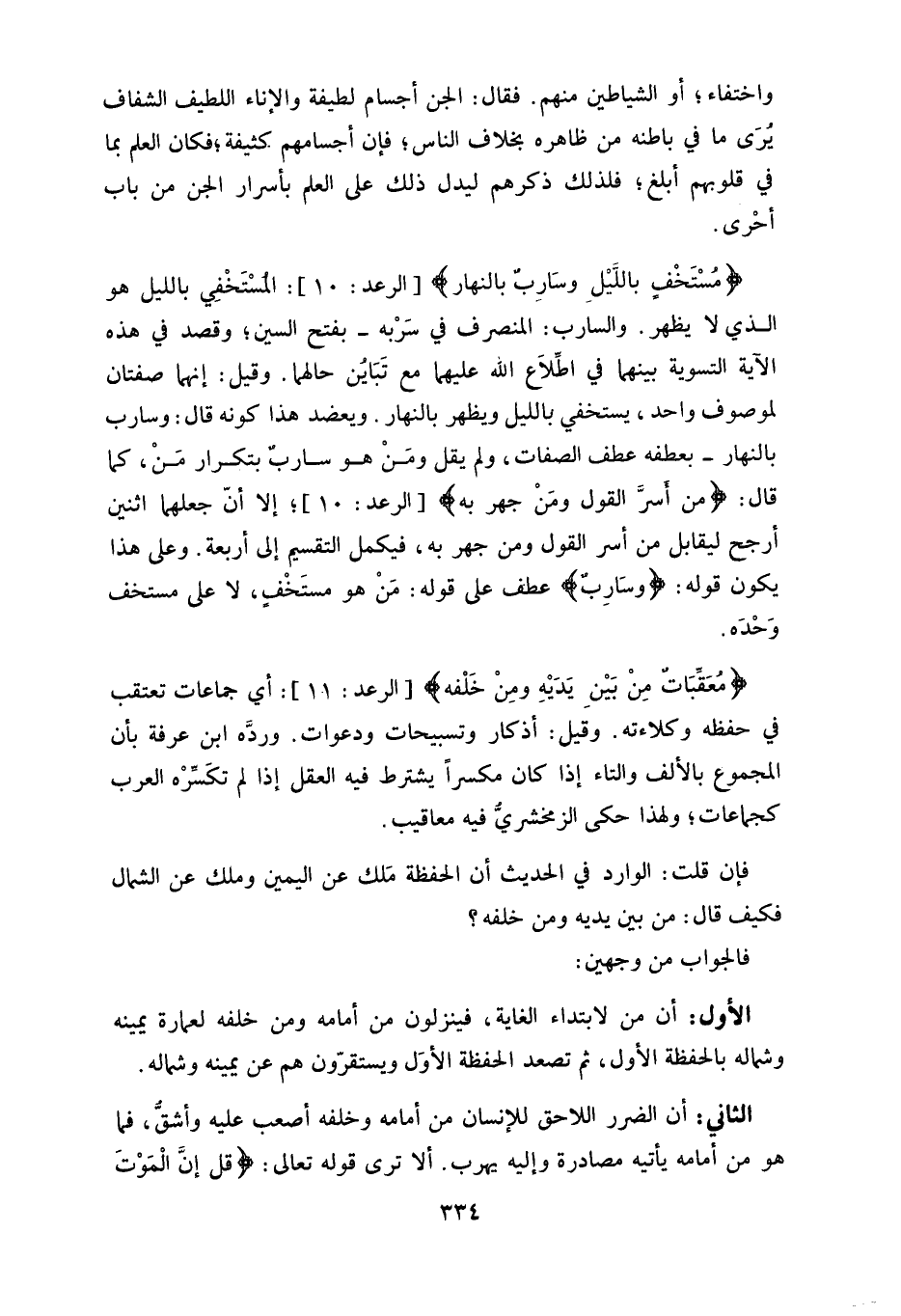 ويعضد هذا كونه قال: وسارب بالنهار - بعطفه عطف الصفات، ولم يقل ومَنْ هو ساربٌ بتكرار مَنْ، كما قال: (من أسَّر القول ومَنْ جهر به) ، إلا أنَّ جعلهما اثنين أرجح ليقابل من أسر القول ومن جهر به، فيكمل التقسيم إلى أربعة.
