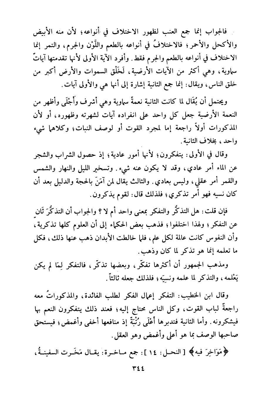 وقال ابن الخطيب: التفكر إعمال الفكر لطلب الفائدة، والمذكوراتُ معه