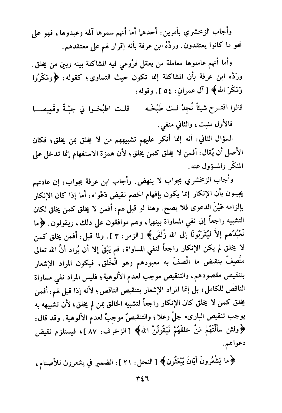 ولما قيل: (أفمن يخلق كمن لا يخلق) لم يكن الإنكار راجعاً لنفي المساواة، فلم يَبْق إلا أن يراد أنَّ الله تعالى مُصِفٌ بنقيض ما اتَّصفَ به معبودهم وهو الْخَلق، فيكون المراد الإشعار بتنقيص مقصودهم، والتنقيص موجب لعدم الألوهية، فليس المراد نفي مساواة الناقص للكامل، بل إنما المراد الإشعار بتنقيص الناقص، لأنه إذا قيل لهم: (أفمن يخلق كمن لا يخلق) كان الإنكار راجعا لتشبيه الخالق بمن لم يخلق، لأن تشبيهه به