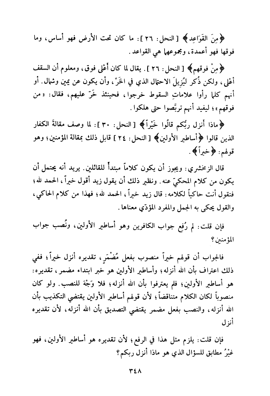 ولو كان منصوباً لكان الكلام متناقضاً، لأن قولهم أساطير الأولين يقتضي التكذيب بأن الله أنزله، والنصب بفعل مضمر يقتضي التصديق بأن الله أنزله، لأن تقديره أنزل.