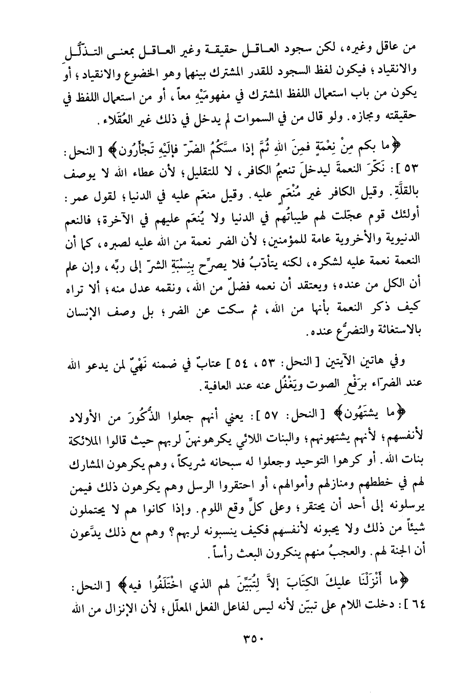 الدنيوية والأخروية عامة للمؤمنين، لأن الضر نعمة من الله عليه لصبره، كما أن النعمة نعمة عليه لشكره، لكنه يتأدّبُ فلا يصرِّح بِنِسْبَةِ الشرّ إلى ربِّه، وإن علم أن الكل من عنده، ويعتقد أن نعمه فضلٌ من الله، ونقمه عدل منه، ألا تراه كيف ذكر النعمة بأنها من الله، ثم سكت عن الضر، بل وصف الإنسان بالاستغاثة والتضرّع عنده.