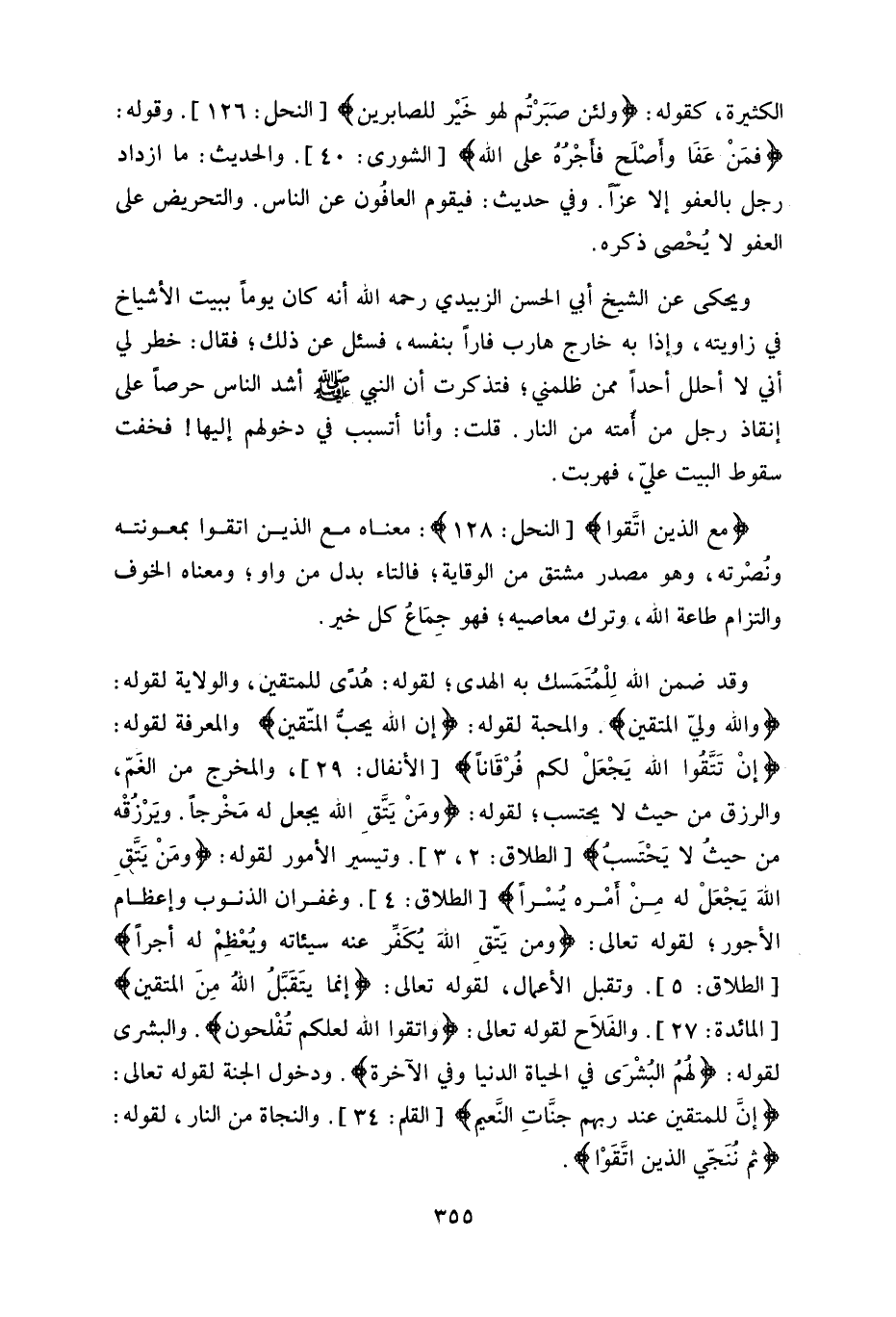 والمحبة لقوله: (إن الله يحبّ المتّقين) والمعرفة لقوله: (إنْ تَتَّقوا الله يَجْعَلْ لكم فرْقَانا) ، والمخرج من الغَمّ، والرزق من حيث لا يحتسب، لقوله: (ومَنْ يَتَّقِ الله يجعل له مَخْرجاً. ويَرْزُقْه من حيث لا يَحْتَسب) .