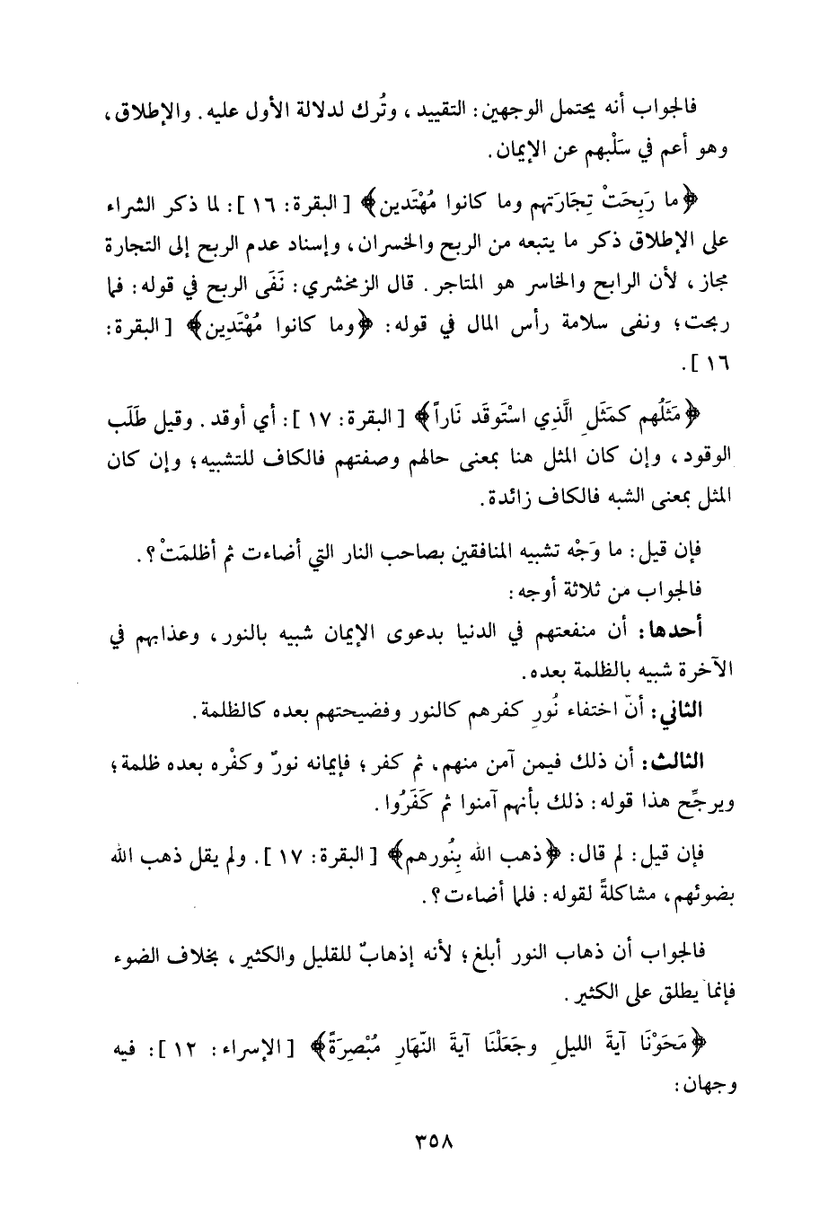 فالجواب أن ذهاب النور أبلغ، لأنه إذهابٌ للقليل والكثير، بخلاف الضوء