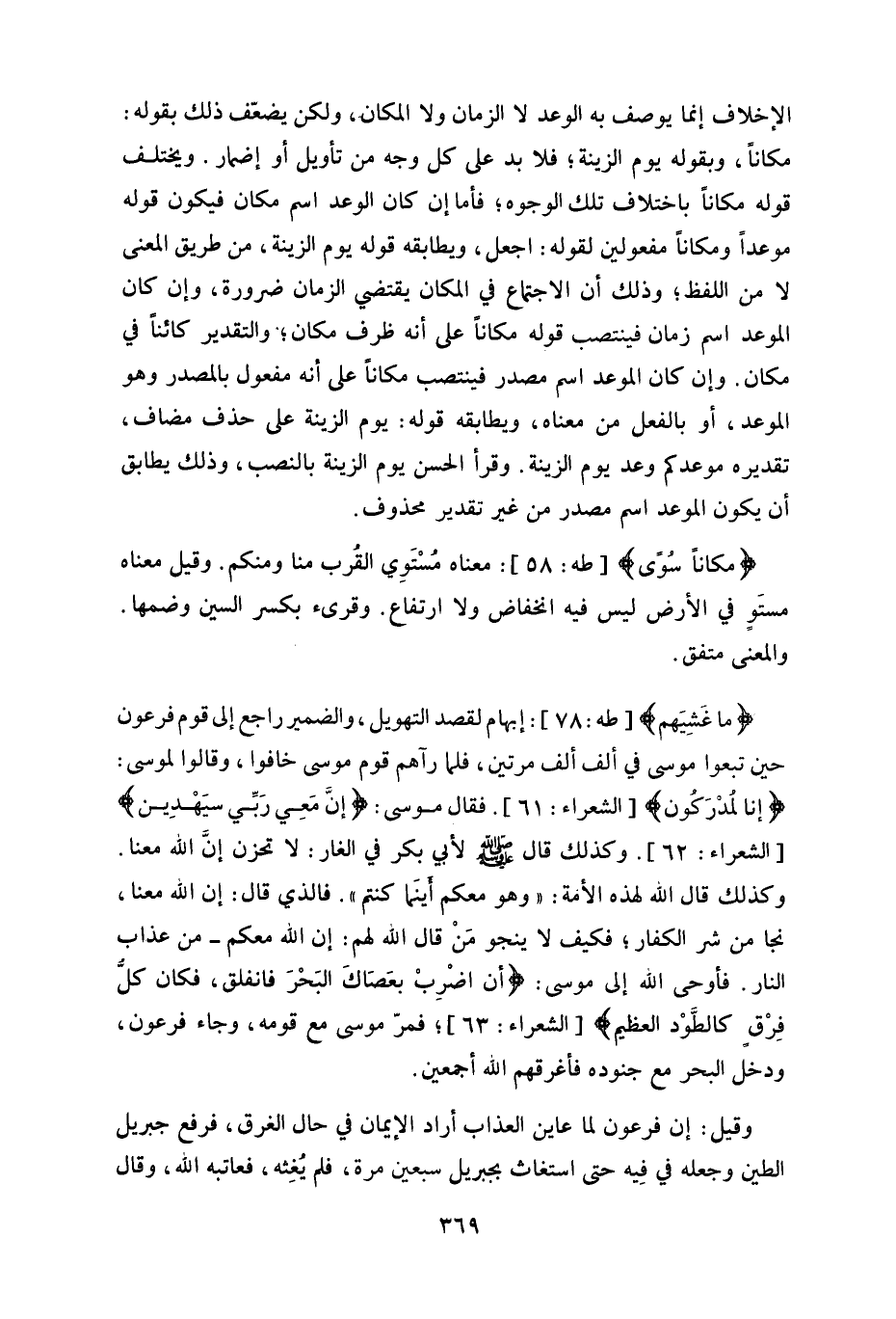 ويختلف قوله مكاناً باختلاف تلك الوجوه، فأما إن كان الوعد اسم مكان فيكون قوله موعداً ومكاناً مفعولين لقوله: اجعل، ويطابقه قوله يوم الزينة، من طريق المعنى لا من اللفظ، وذلك أن الاجماع في المكان يقتضي الزمان ضرورة، وإن كان الموعد اسم زمان فينتصب قوله مكاناً على أنه ظرف مكان، والتقدير كائناً في مكان.
