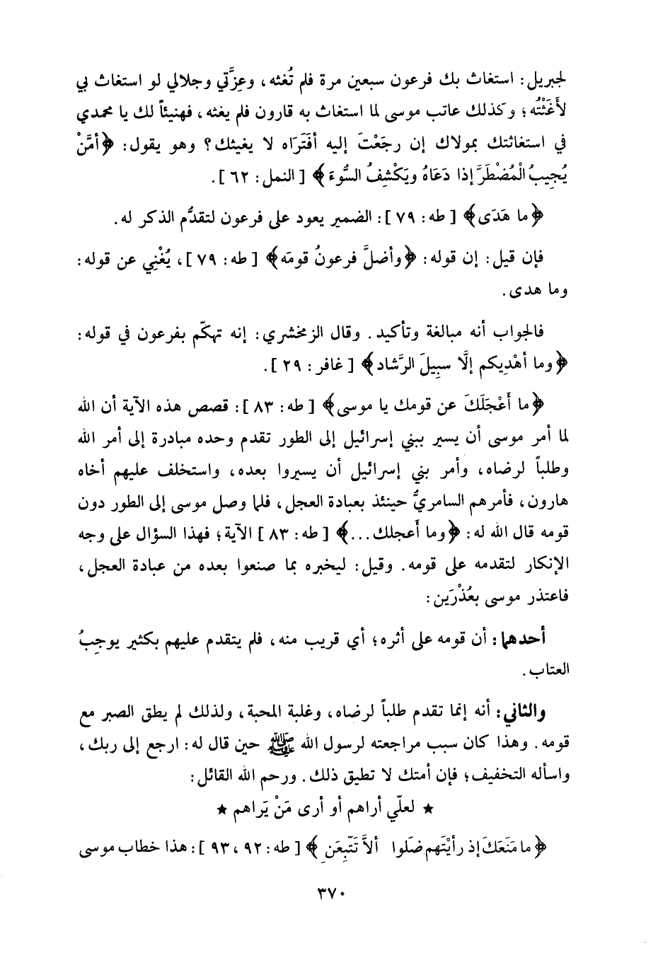 لجبريل: استغاث بك فرعون سبعين مرة فلم تغثه، وعِزَّتي وجلالي لو استغاث بي لأَغثته، وكذلك عاتب موسى لما استغاث به قارون فلم يغثه، فهنيئاً لك يا محمدى في استغاثتك بمولاك إن رجَعْتَ إليه أفَتَرَاه لا يغيثك؟!! ، وهو يقول: (أَمَّنْ يُجِيبُ الْمُضْطَرَّ إِذَا دَعَاهُ وَيَكْشِفُ السُّوءَ) .